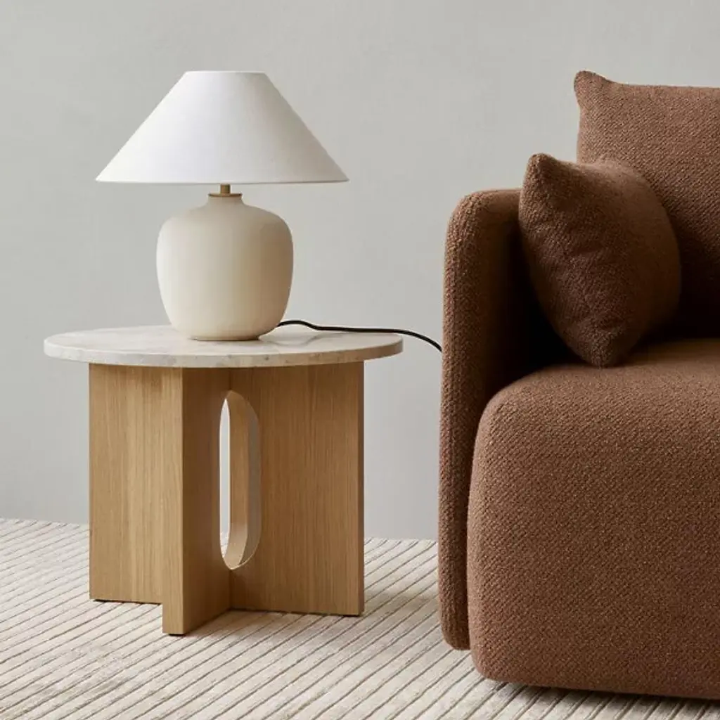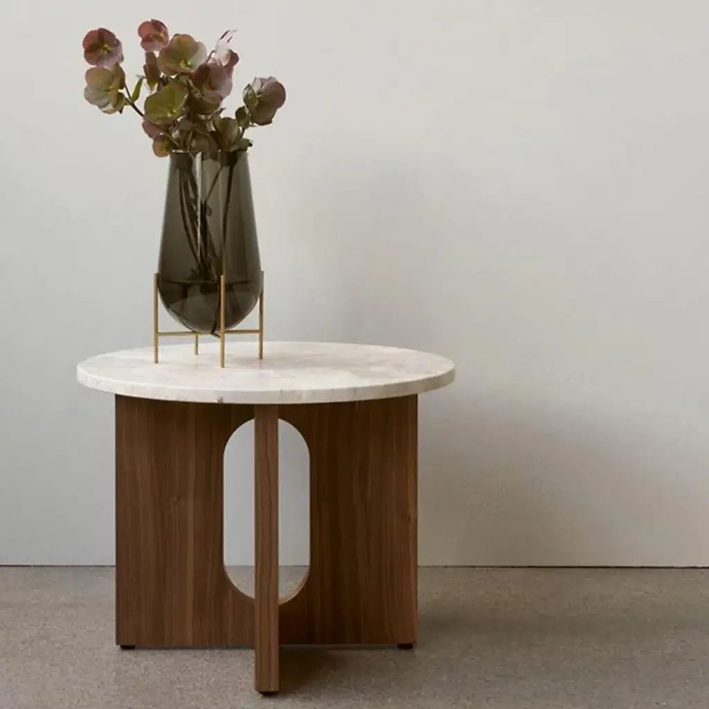 Spruce up your interiors with the refined modern lines of the Androgyne Side Table, Wood Base from Audo Copenhagen. Cleverly crafted from a mixture of materials, it pairs a wide cross base with a rounded flat top. This combination of clean curves and flat planes lends it a clever, sculptural character that works well with a wide array of indoor décor styles. The side table's Scandinavian stylistic sensibility is showcased by an open oval cutout at the center of the table’s base. It provides an inspired display of negative space while still providing ample space for accessories or small display items.