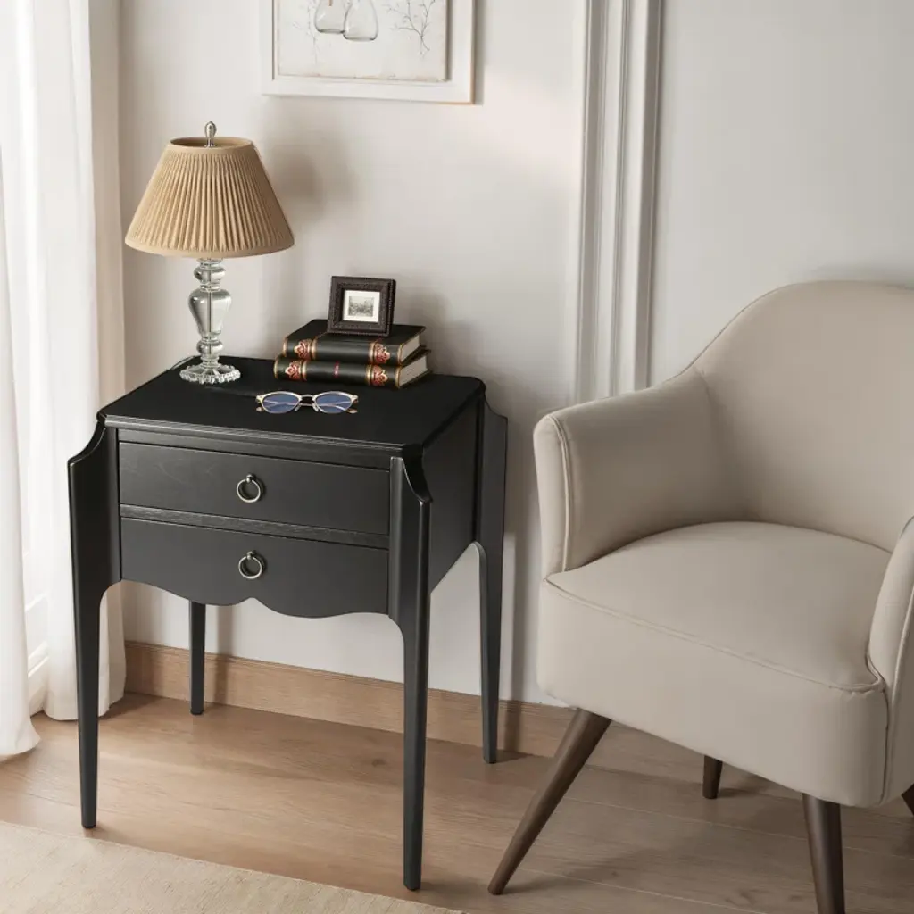 This lovely campaign style Anew End Table with Storage features x-supports and a classic finish. Silver hardware adds a metallic pop on the face of the spacious drawer. With a polished appearance, this functional end table is a great addition to the den, office, living space or bedroom. A perfect place to stow reading and writing materials, chargers and other small items, this table adds elegance and style to a contemporary space.