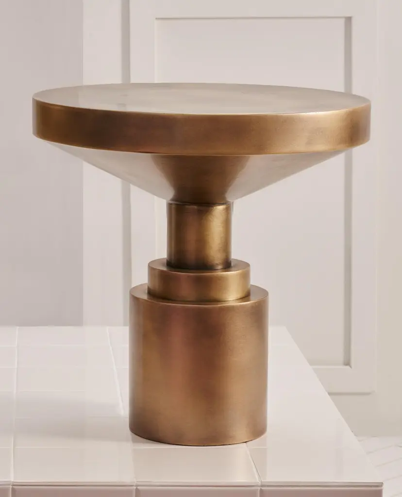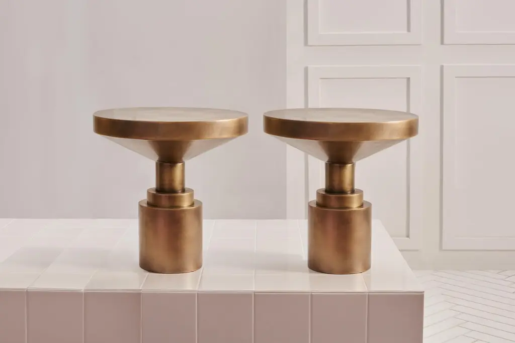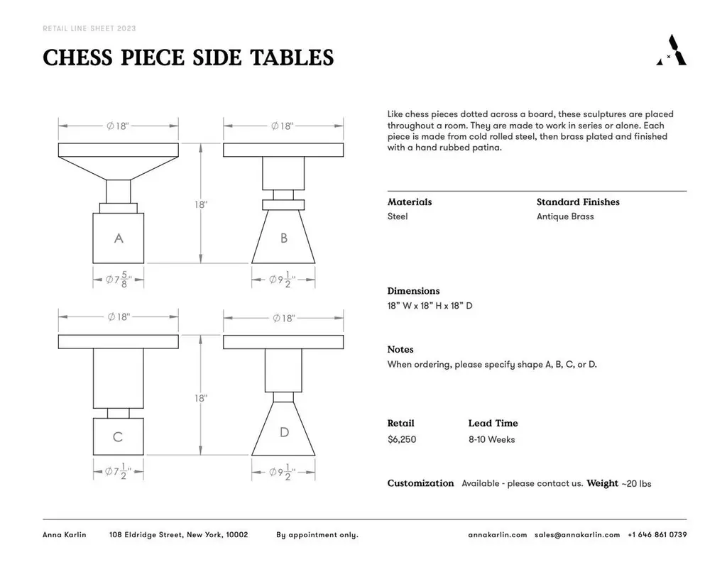 Like chess pieces dotted across board, these sculptures are placed throughout a room. They are made to work in series or alone each of the four shapes is made from cold rolled steel then brass plated and finished with a hand rubbed patina. Handmade in New York.Materials: SteelDimensions: W – 18?, H – 18?, D – 18?Customization: Available.