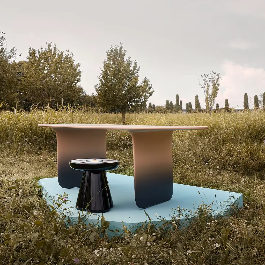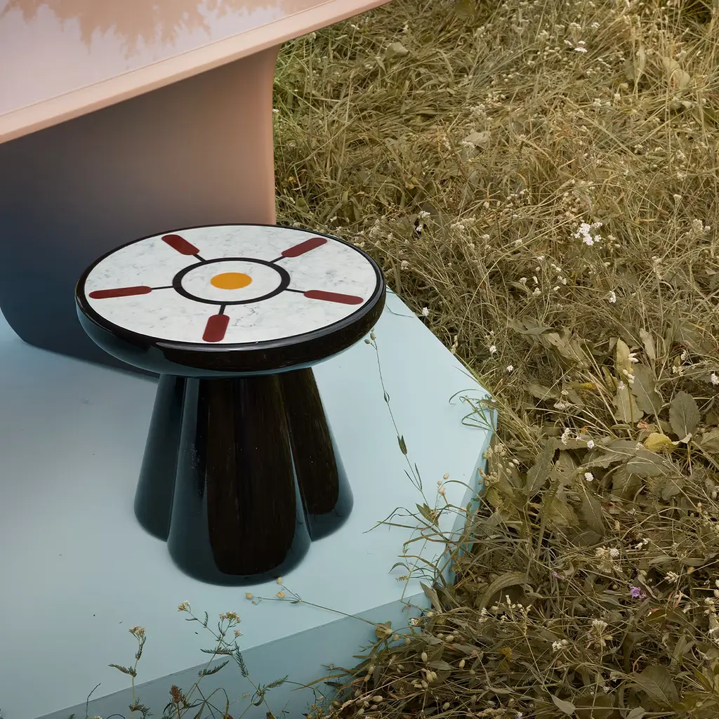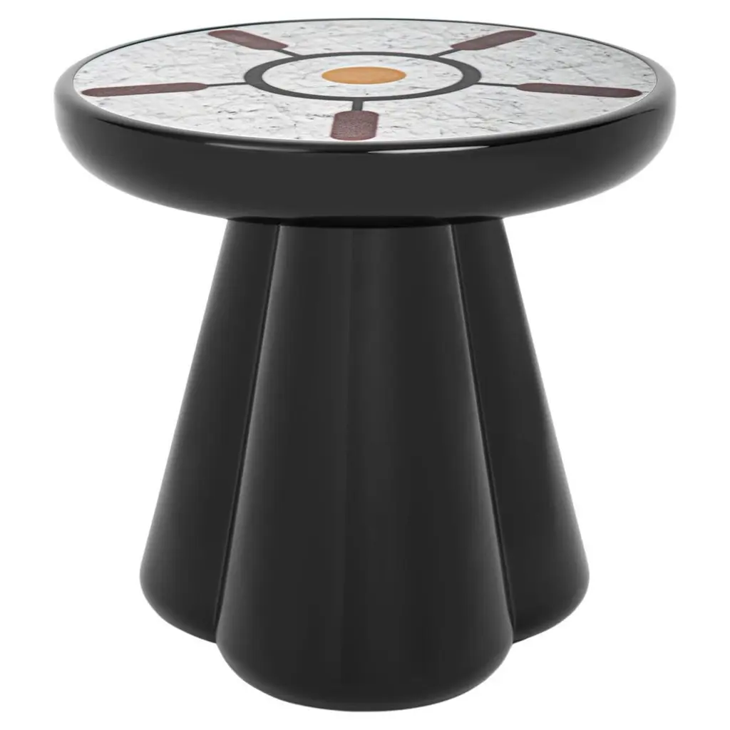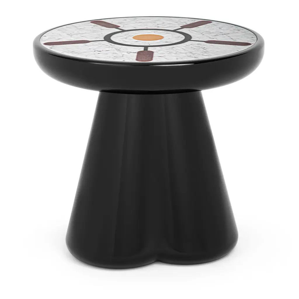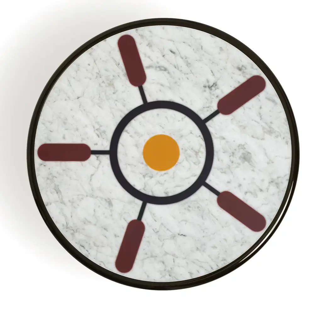 Resin circles, lines and orbits blended together on a thick marble top. A large base split in three, gives the low table stability and makes its design unique.