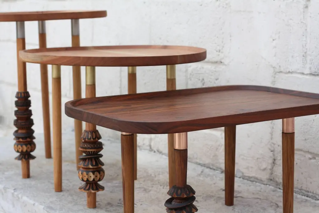 This set of coffee tables are part of a collection worked hand-by-hand with Mexican artisan Antelmo.Antelmo was born and raised in a small town in central Mexico named Santa María Rayón, State of Mexico. Antelmo has dedicated his life to become a master in turned wood. Taught since little, and even though this is a typical Craft from Oaxaca, he has managed to become one of the leader artisans in the creation of traditional chocolate whisks.In this collaboration we bring to life the combination of traditional aesthetics and high-end materials, design and passion.Each of the pieces is carefully handmade in Mexico, with details made with the unique technique of a “Molinillo”, the traditional Mexican chocolate whisk, made especially to foam hot chocolate. Each of them is turned out of one solid piece of wood, and then carefully hand-carved. About the pieces:“Mesas Antelmo” “Antelmo Coffee Tables”:Tall side table “Antelmo I”: banak solid wood and stainless steel.Round side table “Antelmo II”: Red cedar solid wood and brass.Low side table “Antelmo III”: Tzalam solid wood and copper.