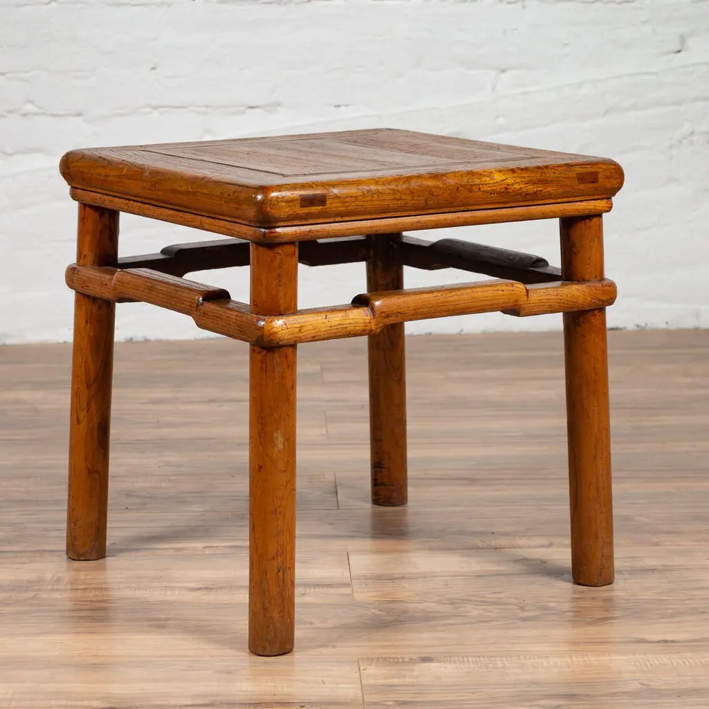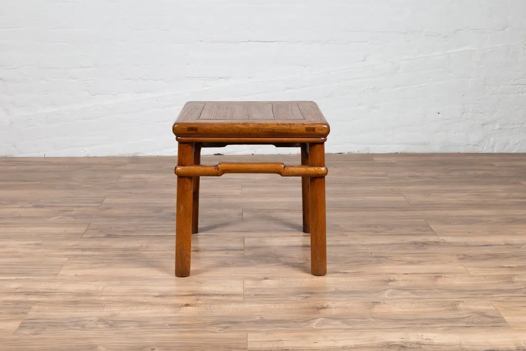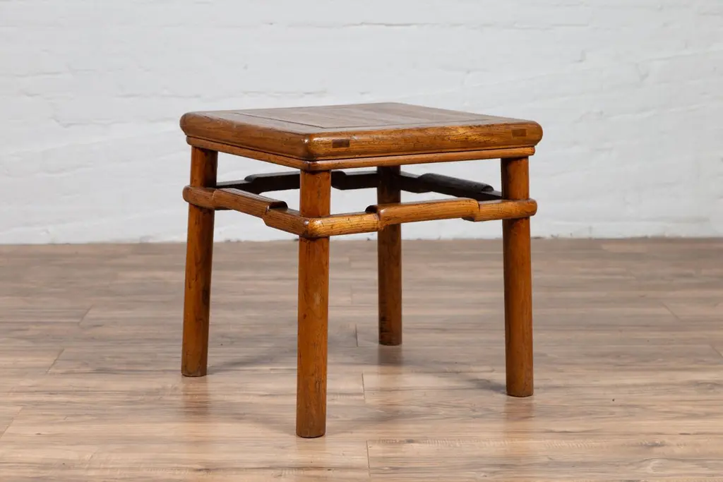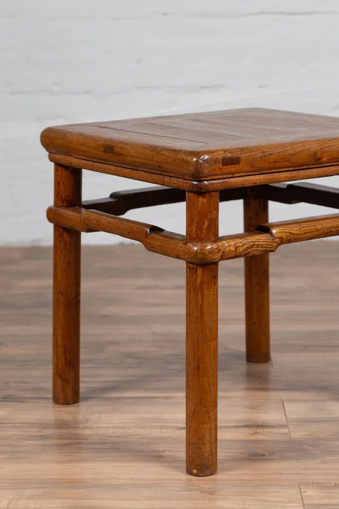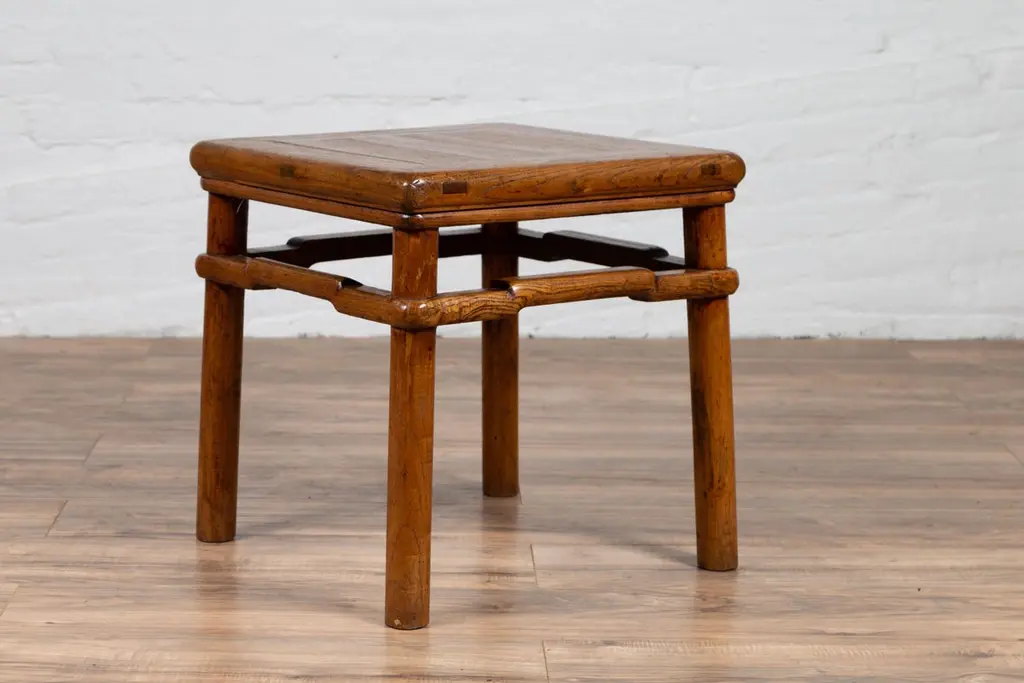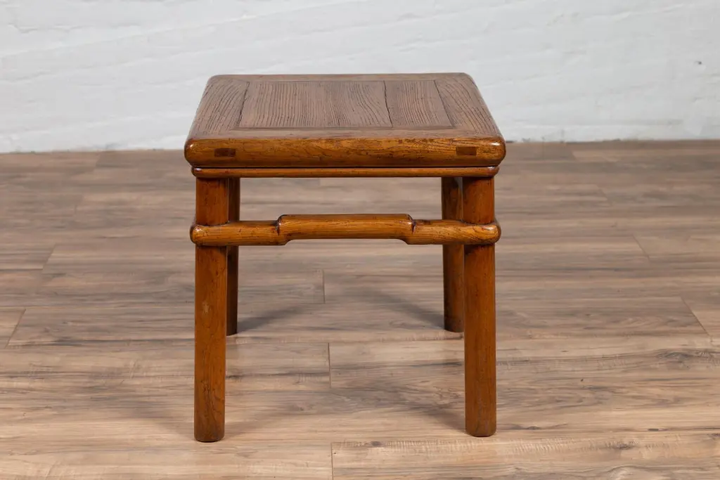 An antique elm wood side table from the early 20th century, featuring a humpbacked stretcher, rich wood grain, and cylindrical legs. Created in China during the later years of the Qing Dynasty, this square table displays a well-proportioned top with a central panel and gently rounded edges, the surface enhanced by the warm patina and character of the elmwood.Below, a continuous humpbacked stretcher wraps around all four sides, offering both structural stability and a sense of rhythm in the design. The table rests on four slightly splaying cylindrical legs, their simple form emphasizing the understated elegance of the piece.With its clean lines and timeless construction, this versatile table can serve as a side table, drinks stand, or low stool, making it adaptable to many settings. Its natural finish and subtle detailing lend it a refined presence, suitable for both traditional and contemporary interiors. Currently, two tables are available, priced and sold individually, allowing them to be paired together or used separately to complement different spaces within the home.
