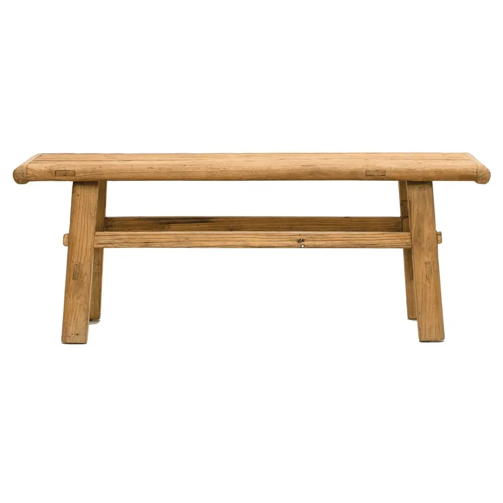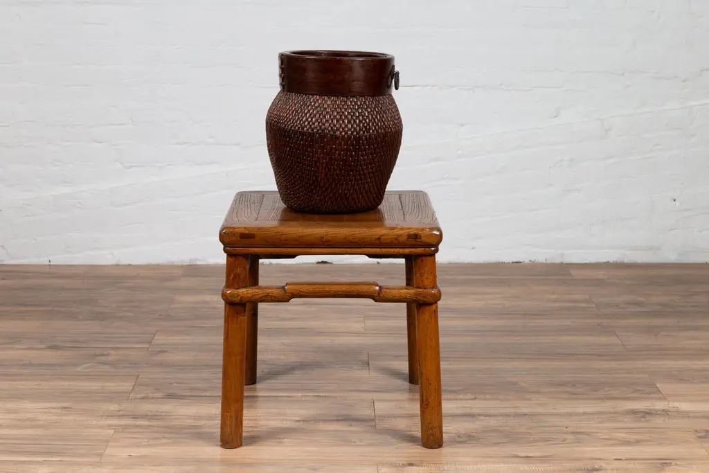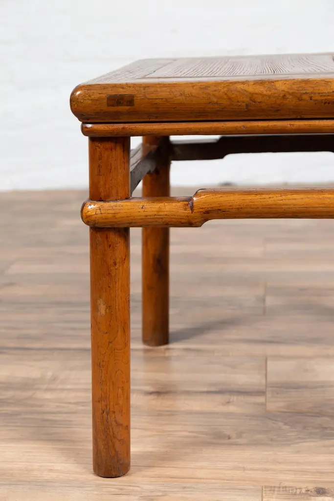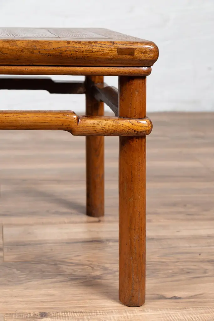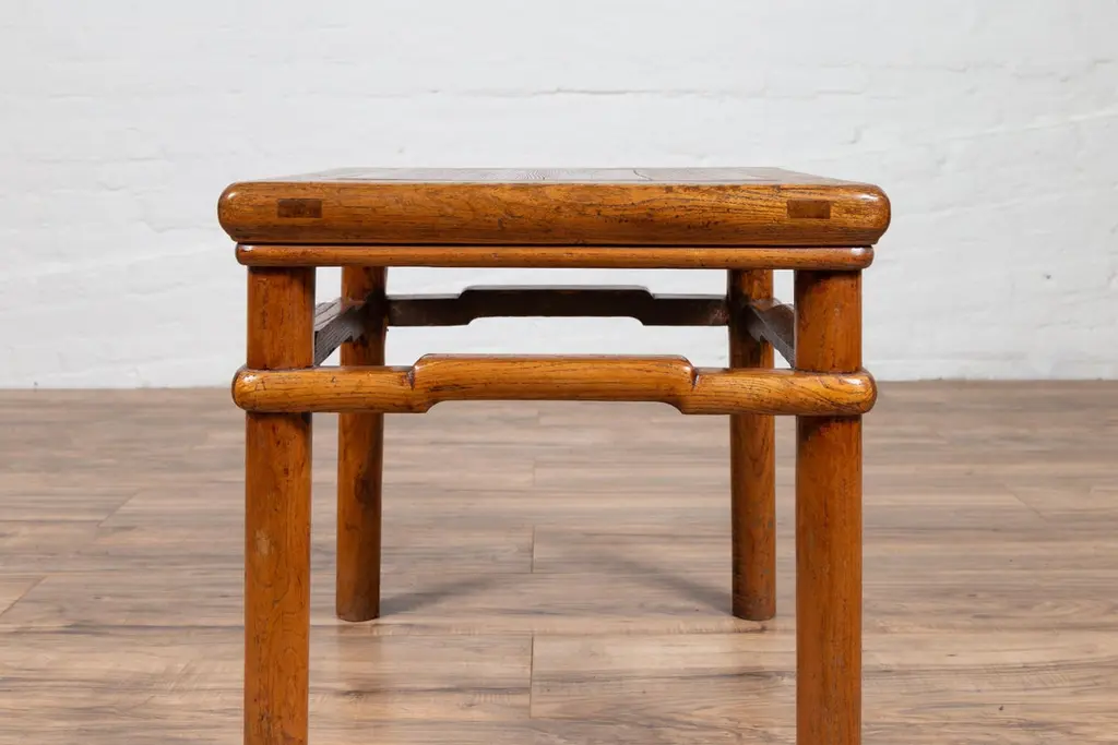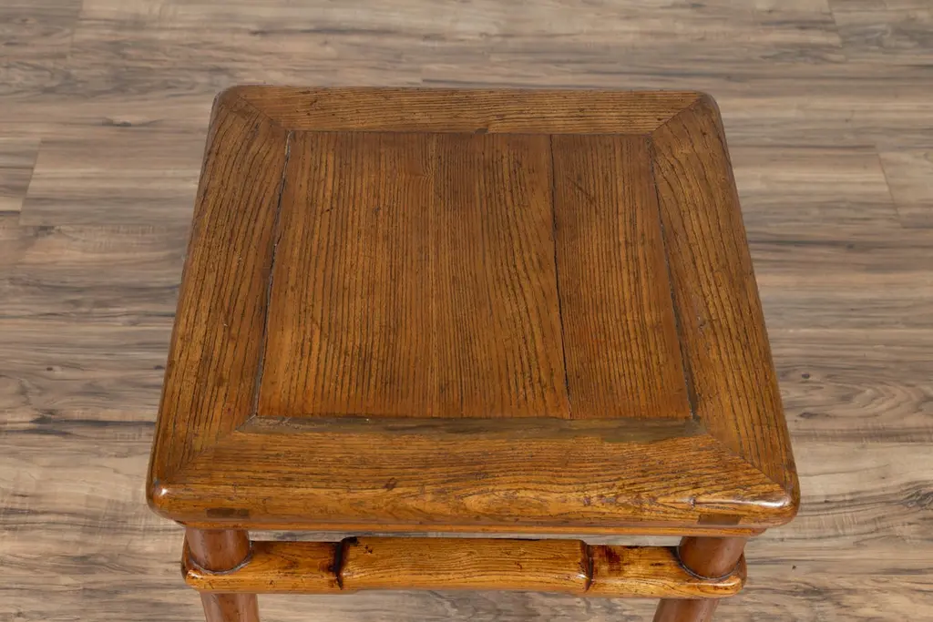 An antique elm wood side table from the early 20th century, featuring a humpbacked stretcher, rich wood grain, and cylindrical legs. Created in China during the later years of the Qing Dynasty, this square table displays a well-proportioned top with a central panel and gently rounded edges, the surface enhanced by the warm patina and character of the elmwood.Below, a continuous humpbacked stretcher wraps around all four sides, offering both structural stability and a sense of rhythm in the design. The table rests on four slightly splaying cylindrical legs, their simple form emphasizing the understated elegance of the piece.With its clean lines and timeless construction, this versatile table can serve as a side table, drinks stand, or low stool, making it adaptable to many settings. Its natural finish and subtle detailing lend it a refined presence, suitable for both traditional and contemporary interiors. Currently, two tables are available, priced and sold individually, allowing them to be paired together or used separately to complement different spaces within the home.