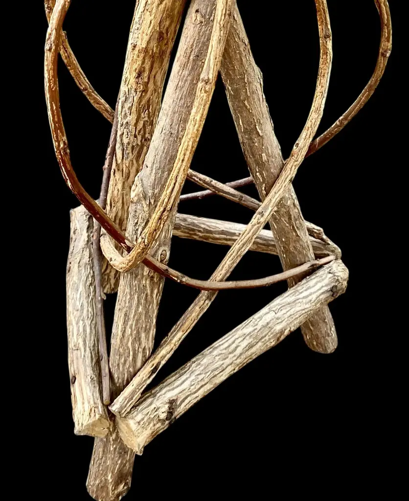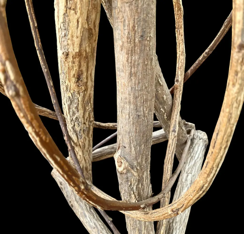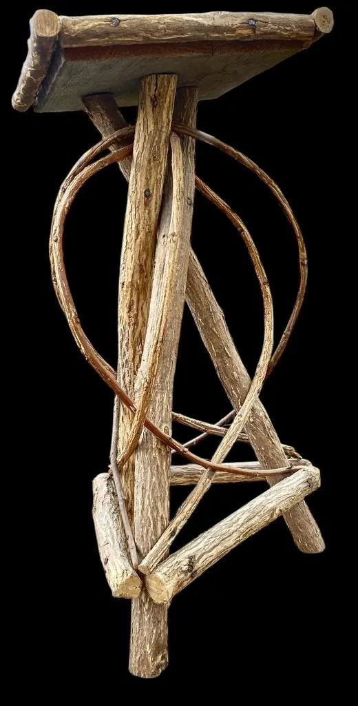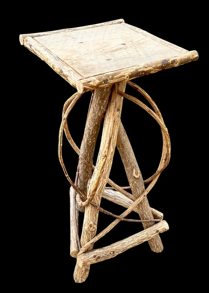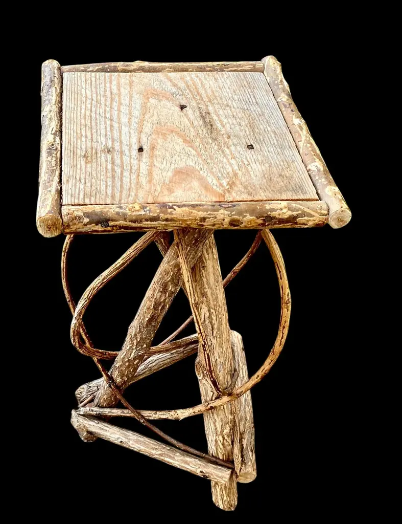 This antique Adirondack table showcases the artistry of folk craftsmanship. Its twig frame supports a weathered gray tabletop.Impressive Rustic Antique ADIRONDACK TWIG TABLEPerfect for Farmhouse decor and or cottage.More than 100 years oldThis is an antique Adirondack twig table. The rustic wood accent table features a wooden twig frame with bentwood twig stretches and accents.This Adirondack side table is more than just furniture; it's a testament to the enduring legacy of Adirondack design in American architecture. With its blend of organic materials and rustic elegance, it serves as a tangible link to a rich tradition that celebrates the beauty of nature in functional and aesthetically pleasing forms.This antique Adirondack twig table is handmade from willow branches, showcasing a rustic, early American design. Its weathered texture and organic form make it an ideal accent for cabin, cottage, or farmhouse spaces.Top surface: 11.75 X 12