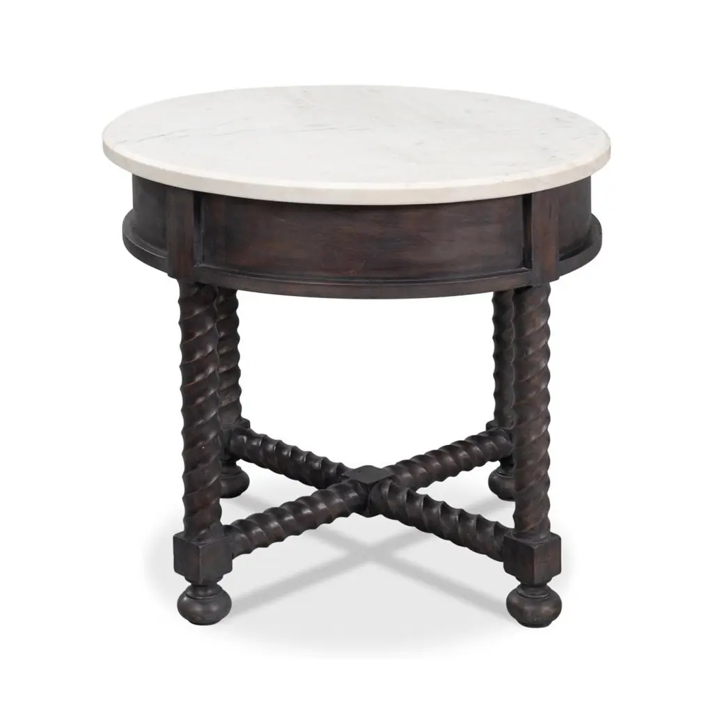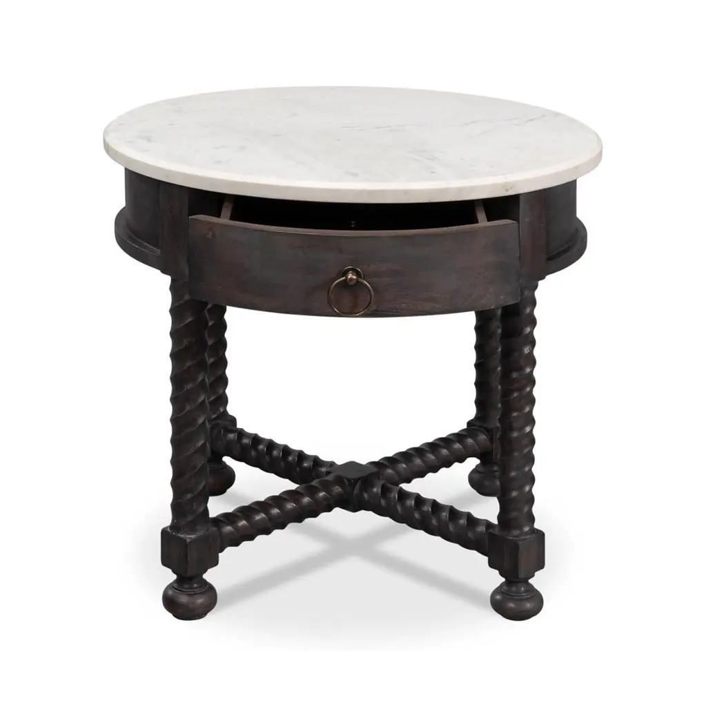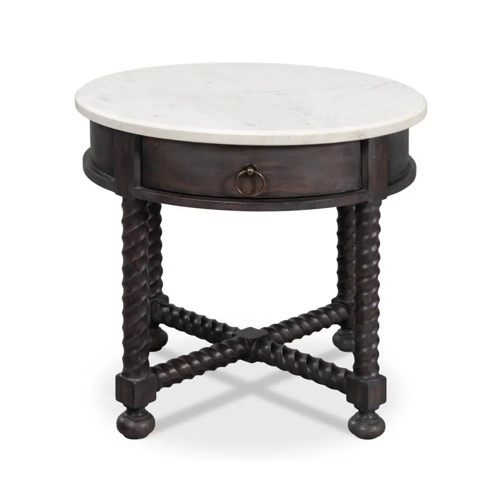 Featuring a luxurious white marble top, this table exudes classic sophistication.The rich, dark wood base is crafted with intricate spiral-turned barley twist legs, giving it a unique and refined look. The single drawer, adorned with a brass ring pull, offers a convenient storage solution for small items.Ideal for a living room, or bedroom, this versatile piece combines practical functionality with exquisite design, making it a beautiful addition to any traditional or vintage-inspired decor.Dimensions: 26" W x 26" D x 25" H