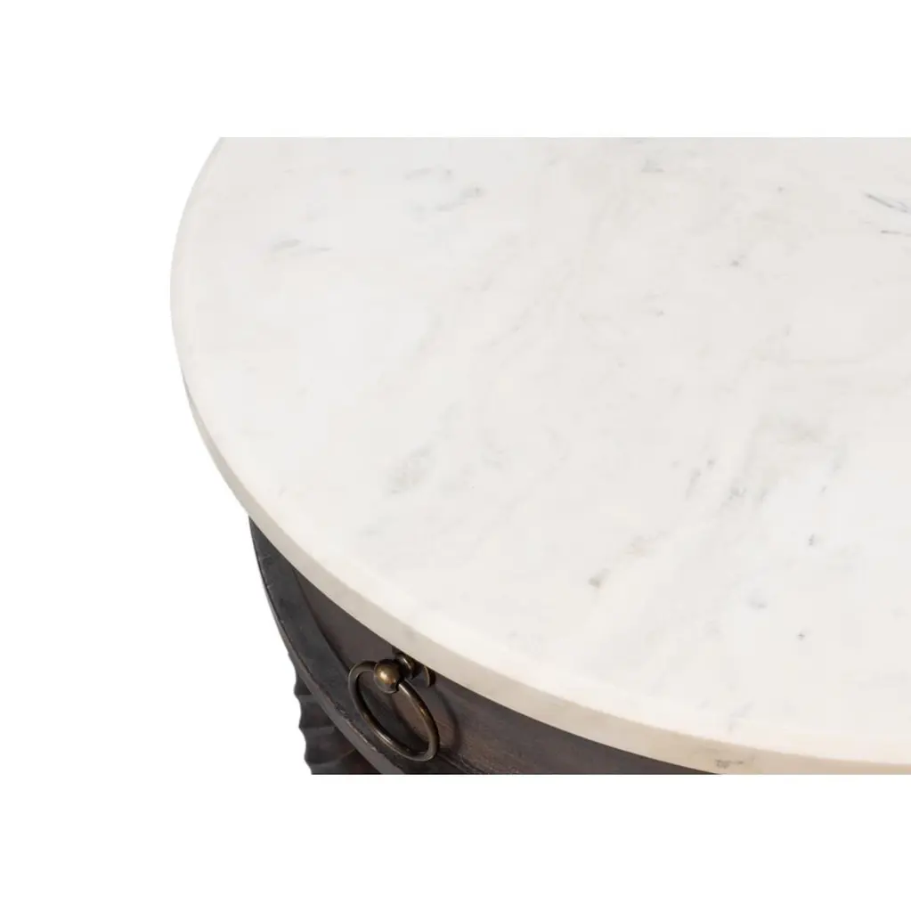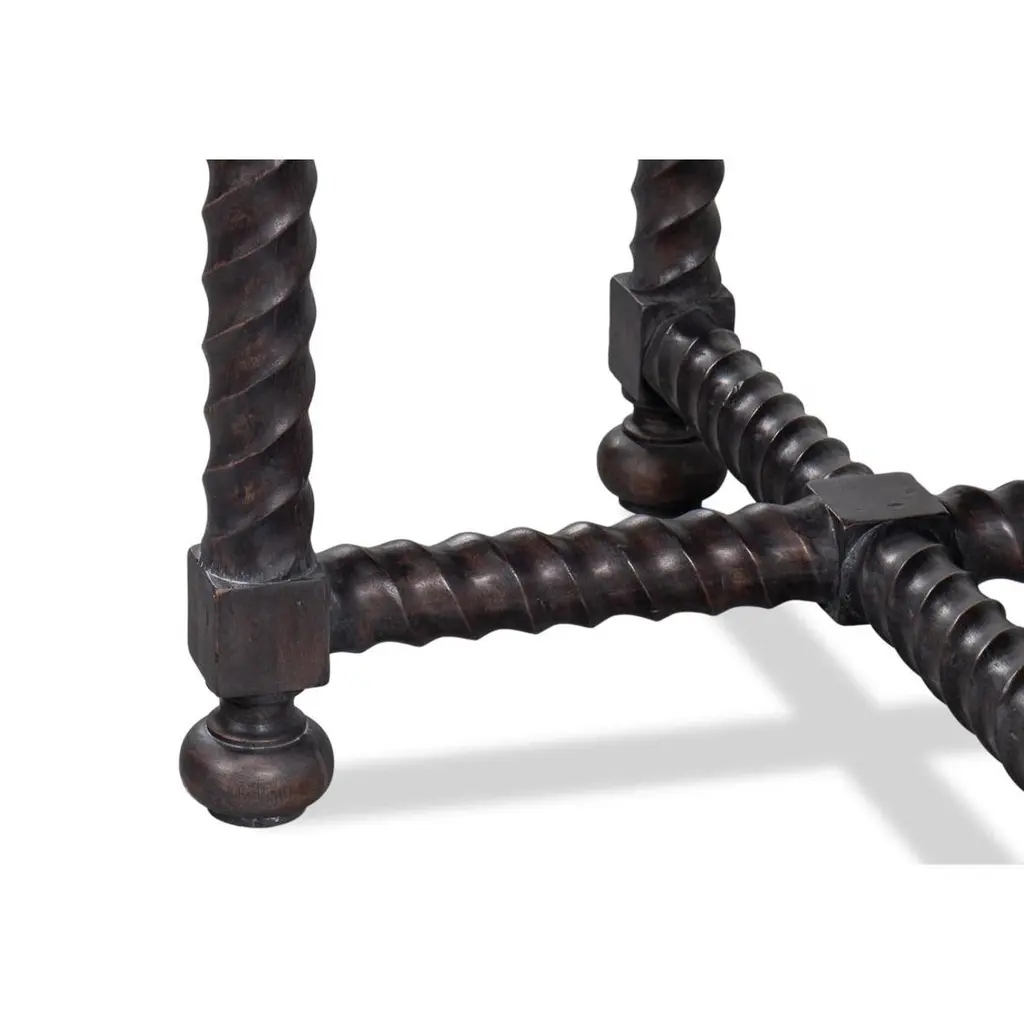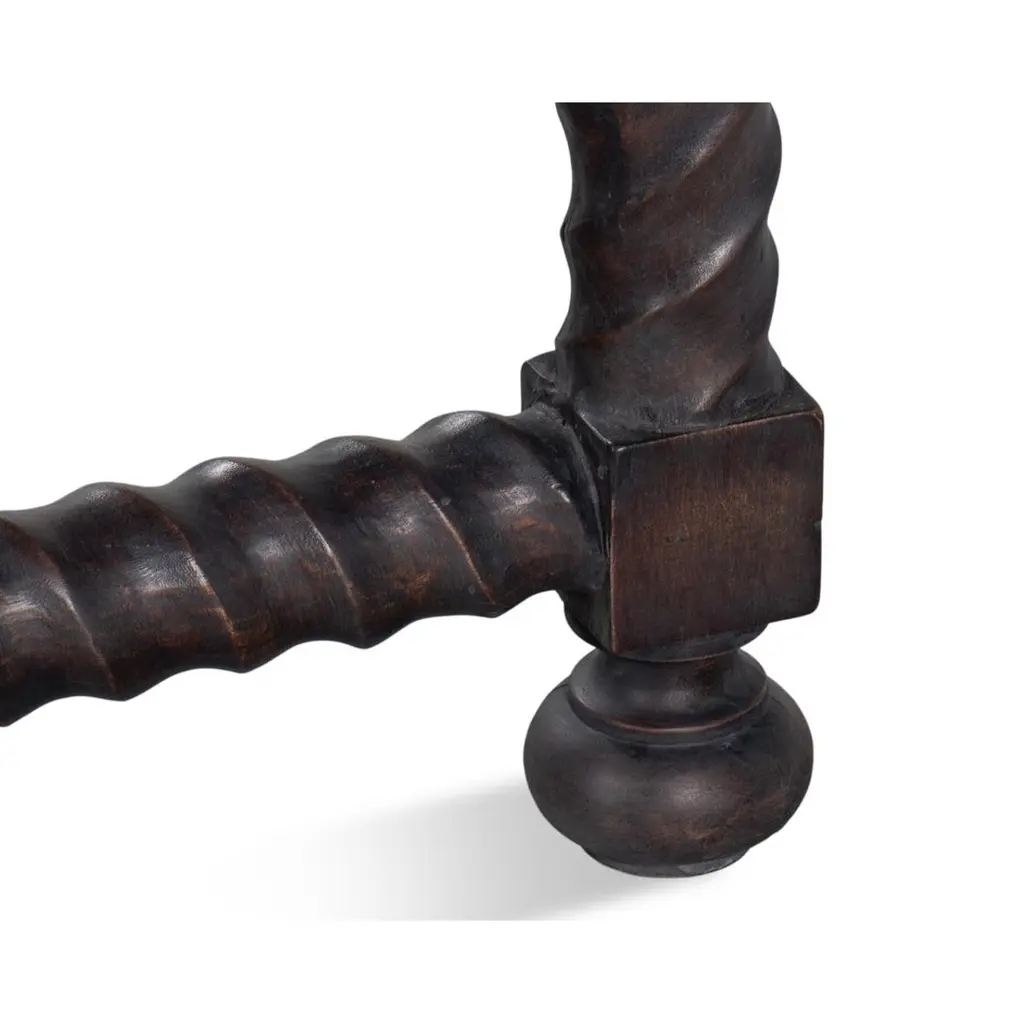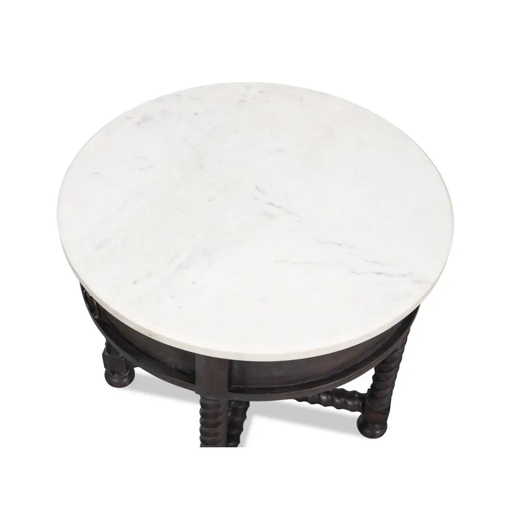 Featuring a luxurious white marble top, this table exudes classic sophistication.The rich, dark wood base is crafted with intricate spiral-turned barley twist legs, giving it a unique and refined look. The single drawer, adorned with a brass ring pull, offers a convenient storage solution for small items.Ideal for a living room, or bedroom, this versatile piece combines practical functionality with exquisite design, making it a beautiful addition to any traditional or vintage-inspired decor.Dimensions: 26" W x 26" D x 25" H