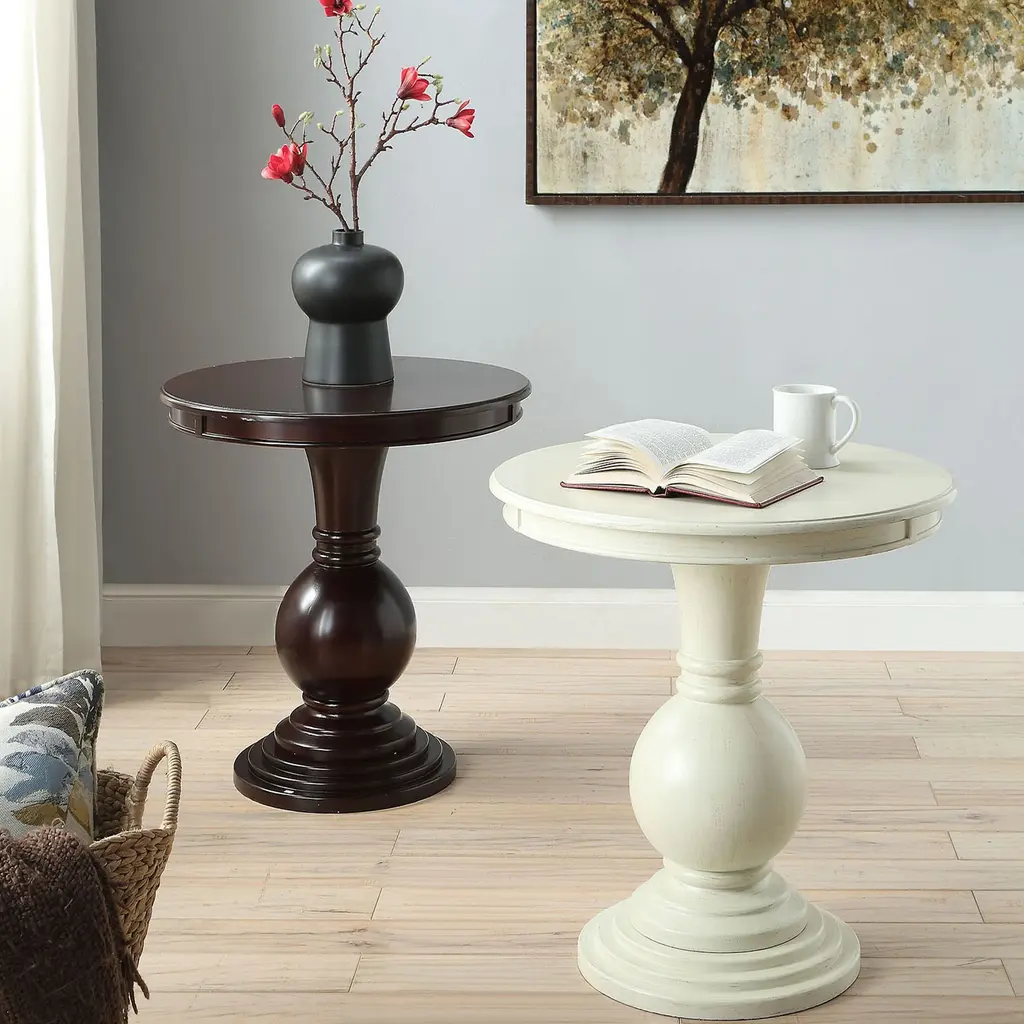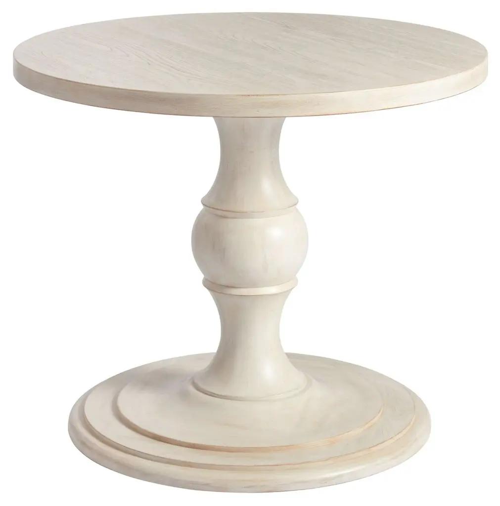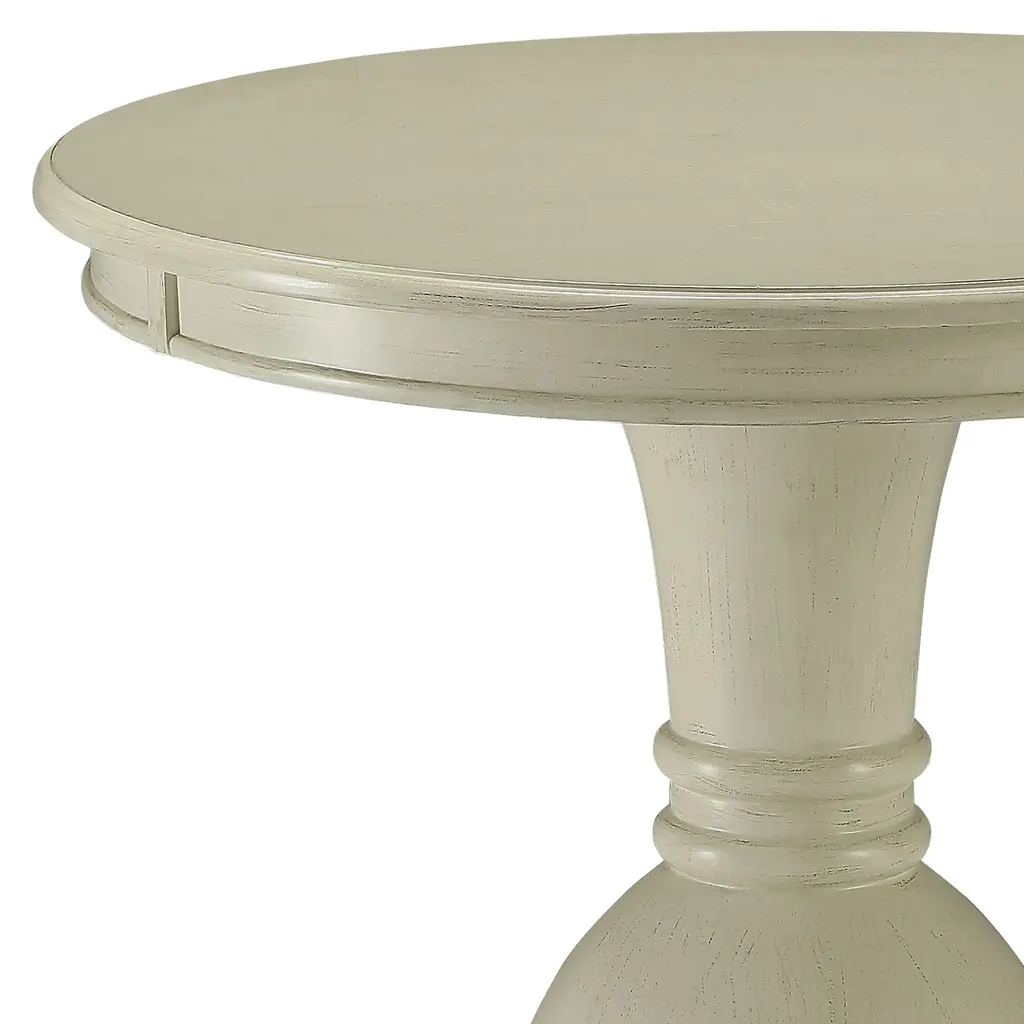 Romance Copy This classic side table features a traditional round top and a turned pedestal base, making it a charming addition to any space. Its compact size is perfect for smaller areas or as a complement to larger furniture pieces, offering a clean and uncluttered appearance with its simplistic design devoid of storage compartments. Set includes One (1) accent table Dimensions 26.5 inches high x 26.5 inches wide x 26.5 inches deep Materials Wood Veneer, MDF, Poly-Resin Pedestal Finish color Antique White