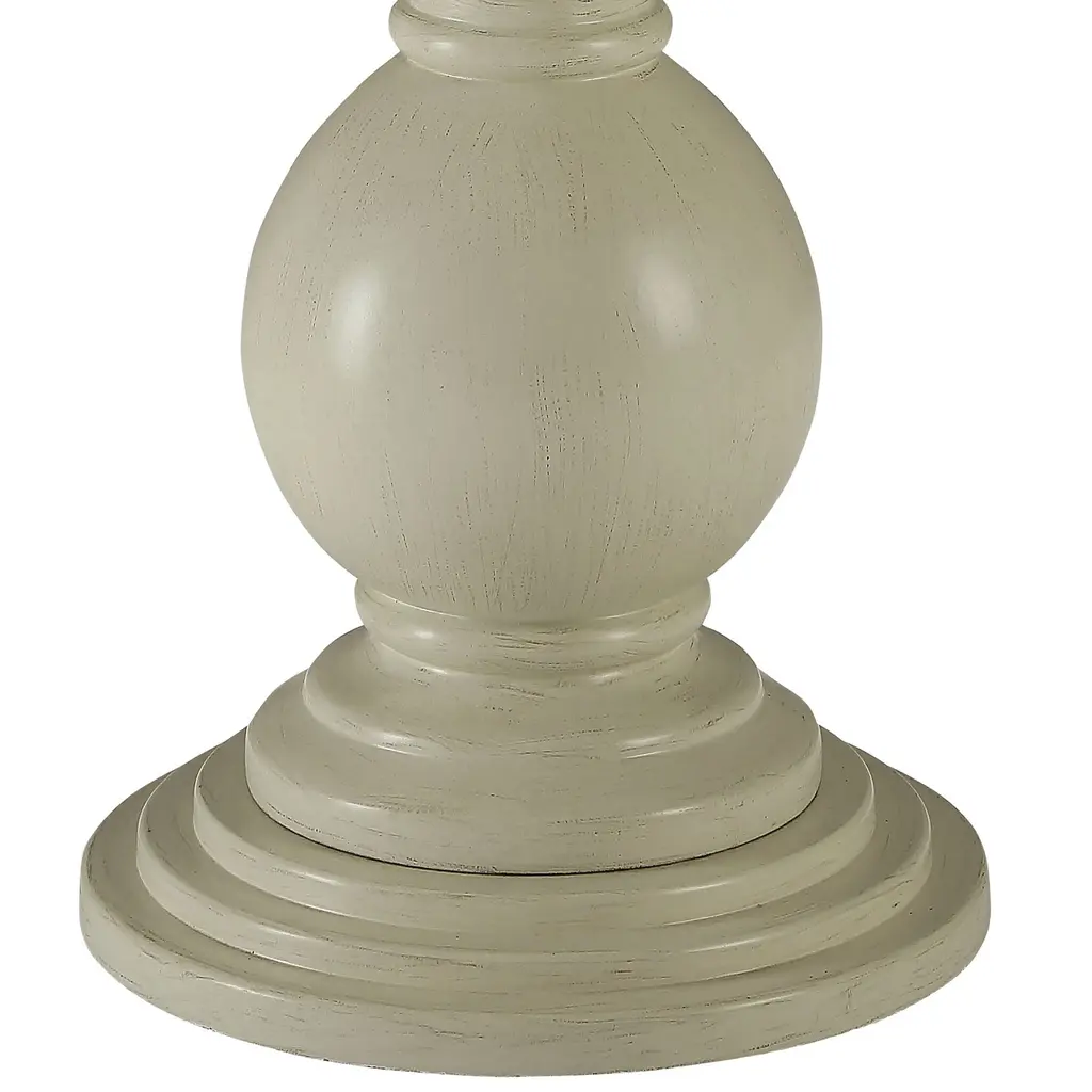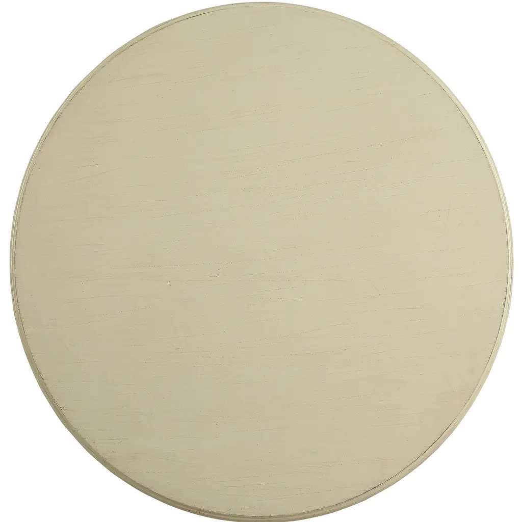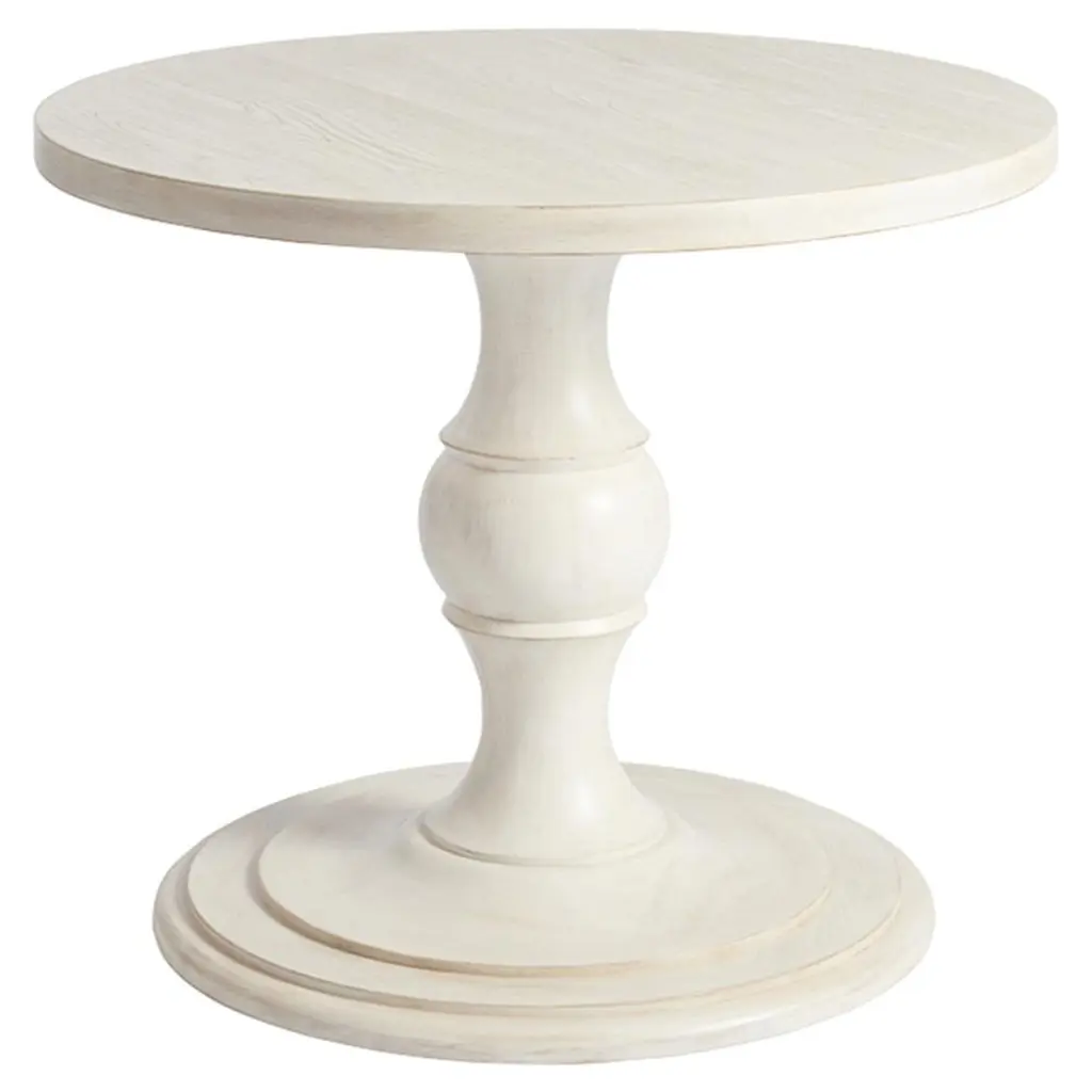 Romance Copy This classic side table features a traditional round top and a turned pedestal base, making it a charming addition to any space. Its compact size is perfect for smaller areas or as a complement to larger furniture pieces, offering a clean and uncluttered appearance with its simplistic design devoid of storage compartments. Set includes One (1) accent table Dimensions 26.5 inches high x 26.5 inches wide x 26.5 inches deep Materials Wood Veneer, MDF, Poly-Resin Pedestal Finish color Antique White
