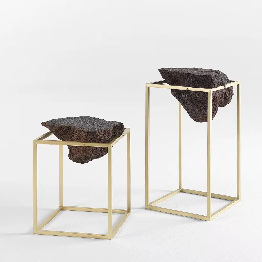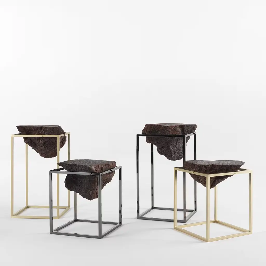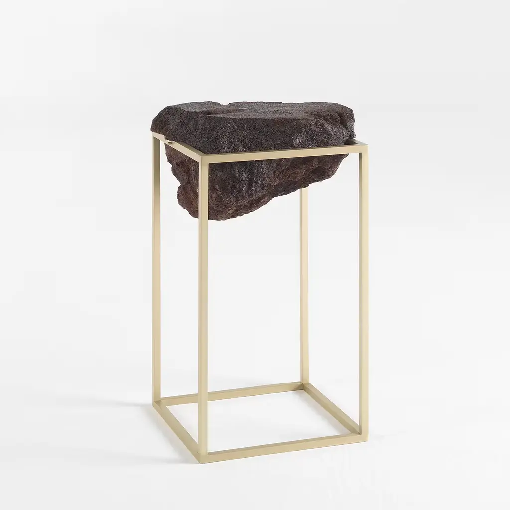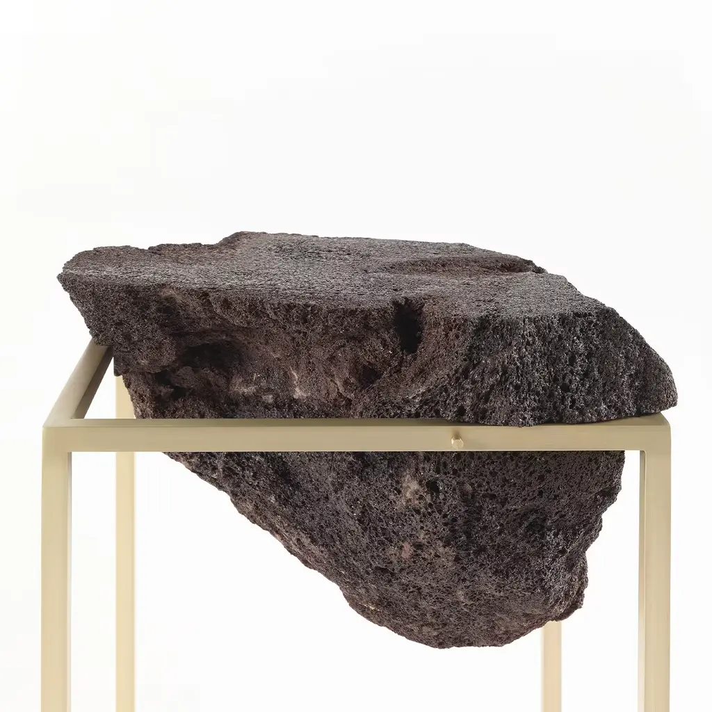 "Nature in its primordial form. Antivol presents a fragment of lava stone from Sicily, cut in half and supported by an essential metal frame. Pure and primitive matter becoming functional, for a side table that is always unique." Side table with brass structure in matt gold finishing. Top with water jet cut natural Lava stone. Variation Details: Side table with brass structure in black chrome or matt gold finishing. Top with water-jet cut natural Lava stone.