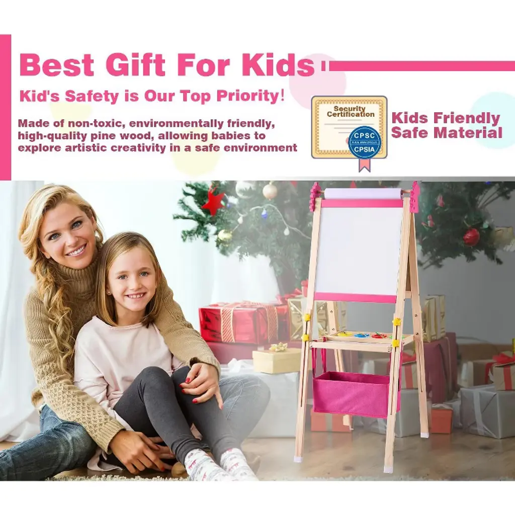 Unlock your child's imagination with this 2-in-1 double sided easel, featuring both a magnetic chalkboard and a dry-erase painting board perfect for endless creative expression. Crafted from high-density New Zealand pine and boasting adjustable height, it grows with your child while maintaining a sturdy and safe workspace. With ample storage, a foldable design, and over 100 included accessories, this easel inspires artistic adventures for boys and girls ages 3 to 10.