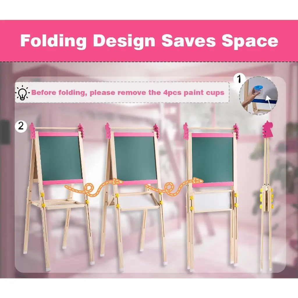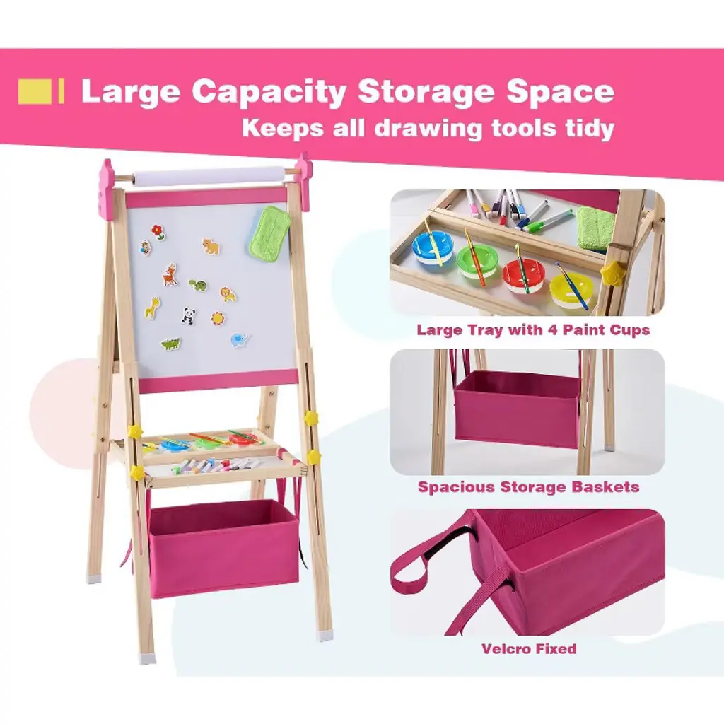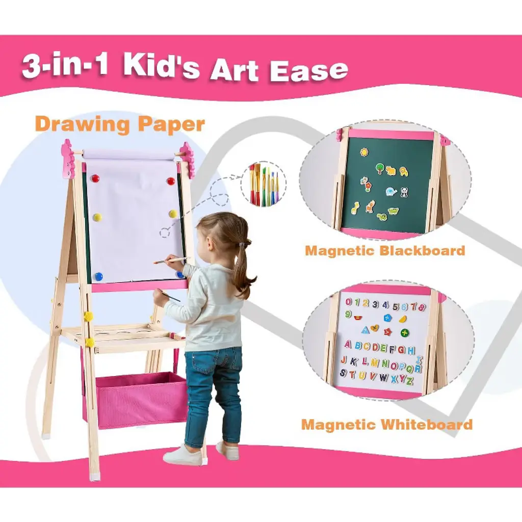 Unlock your child's creativity with this versatile 2-in-1 double-sided easel, featuring both a magnetic dry erase board and a magnetic chalkboard to inspire endless artistic adventures. Crafted from high-density natural pine wood and designed with adjustable height, it grows with your little artist from ages 3 to 10. With over 100 included art accessories, ample storage, and a convenient foldable design, this easel is the perfect gift to spark imagination and keep art essentials organized.