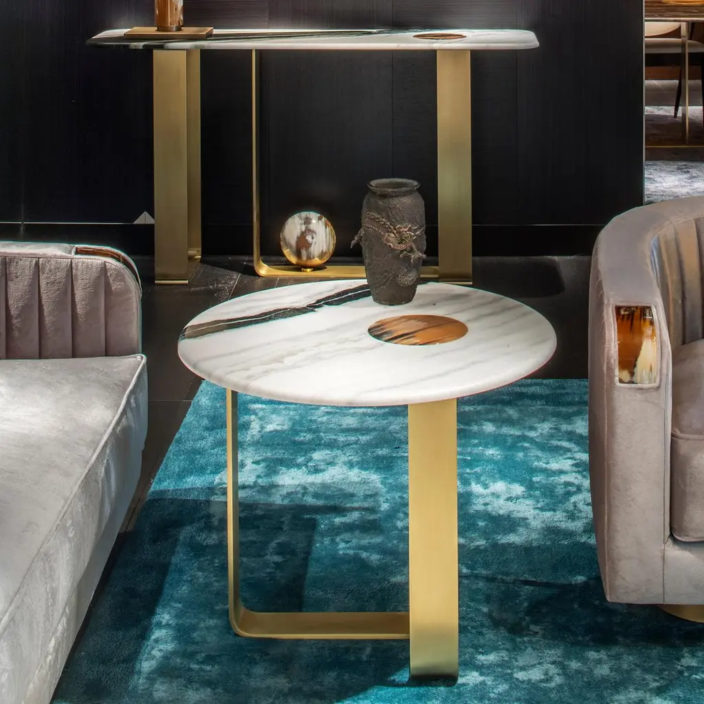 A striking juxtapositions of natural materials and unique colour combinations, Apollo side table will play a starring role in your living room. Fashioned from satin Dalmata marble, the table top is adorned by a round inlay in Corno Italiano with gloss finish, rich in textural interest. An asymmetric structure in satin metal elegantly supports the top while conferring a harmonious balance to the piece.Note: Colors and shades of Corno Italiano processed by our Company are unique and due to the natural origin of raw material. For this reason Corno Italiano tones that can be seen in pictures are indicative and cannot be reproduced in finished products.