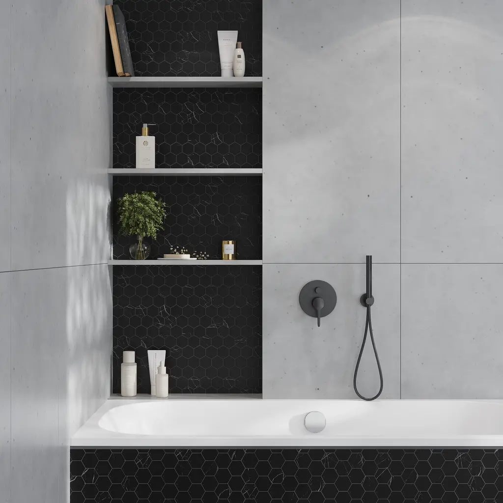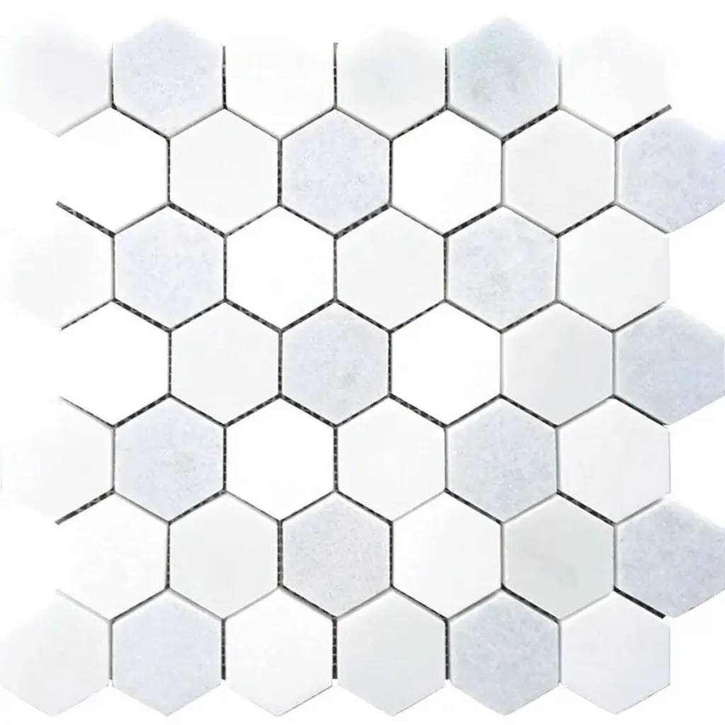 The Nero Honed Hexagon Mosaic Tile exudes modern elegance with its deep jet black surface and timeless hexagonal design. Crafted from premium Eastern Black marble, this tile's honed finish adds a velvety matte texture, creating a subtle yet bold aesthetic. Each 1.9x1.9-inch hexagonal chip is arranged on an 11.8x11.8-inch mesh-mounted sheet, ensuring seamless installation and a flawless geometric pattern. Perfect for sophisticated shower walls, striking bathroom floors, or trendy kitchen backsplashes, this tile offers versatility and durability. Its honed surface minimizes glare while maintaining a sleek appearance, making it an ideal choice for spaces that balance luxury and practicality. Suitable for outdoor and indoor applications, it stands up to light and heavy foot traffic, as well as heat-prone areas. Pair it with gold accents for a luxurious touch, or matte white elements for a bold contrast. Whether you're curating a modern spa-like bathroom or adding drama to a fireplace surround, the Nero Honed Hexagon Mosaic Tile is a design-forward choice that leaves a lasting impression.