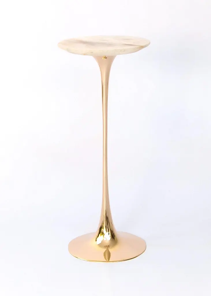 Apple drink table with Onyx top by Fakasaka DesignDimensions: W 25 cm, D 25 cm, H 61 cm.Materials: polished bronze base, translucent Onyx top. Also available in different table top materials:Nero Marquina Marble Marrom Imperial MarblePedra AgateTranslucent Onyx FAKASAKA is a design company focused on production of high-end furniture, lighting, decorative objects, jewels, and accessories. Established in 2007, Fakasaka is the eponymous design company by Brazilian artist Fernando Akasaka distinguished by a penchant for producing intricate detailed cast bronze collectible design objects, furniture and jewelries. Fakasaka explores the contrast between the manmade and the natural through shapes and finishes that create a clear aesthetic. The constant challenge to balance elements is met with an outcome that is a striking assortment of bronze furniture and objects in oxidised and polished finishes, accented with precious regional stones, granites and rich prehistoric reptilian motifs.