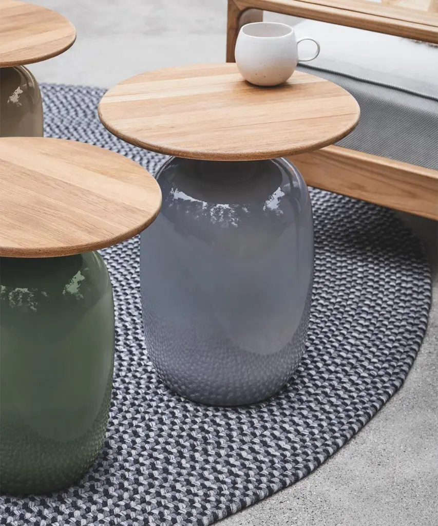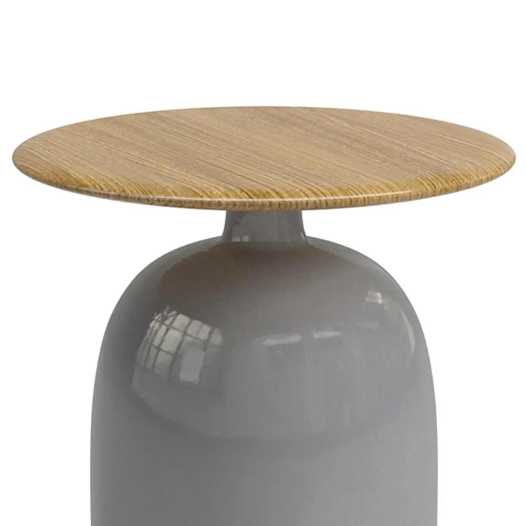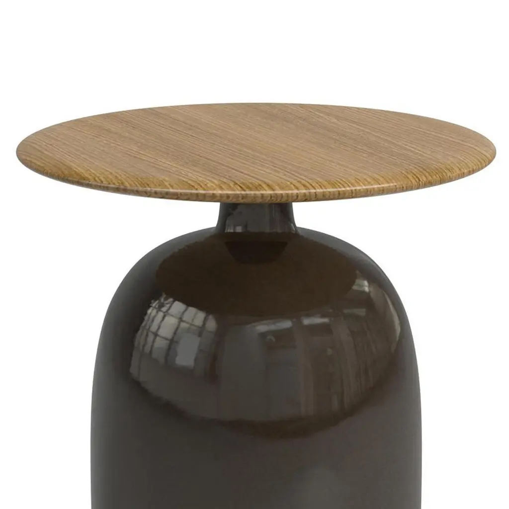 Side table aqua ceramic anthracite made with handcraftedanthracite ceramic base and with teak top. Outdoor-indoor use.Also available with base in green ceramic or in light grey ceramic base,on request.