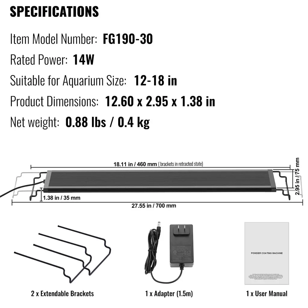 Aquarium Light Adjustable Timer And Power-Off Memory, With Abs Shell Extendable Brackets - Black - 12-18 Inch Aluminum Shell Without Display