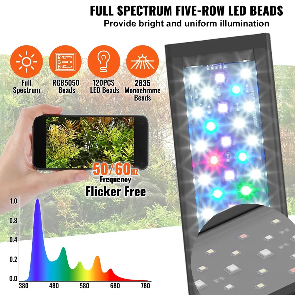 Upgraded High-quality LED Lights: full spectrum 5-row LED aquarium lights feature high-quality RGB5050 and 2835 monochrome beads, providing more uniform and stable lighting without flicker. Full spectrum lighting not only benefits your fish but also enhances visual experience, with energy-saving and long-lasting performance lasting up to 30,000 hours. Customizable Lighting Mode: You can adjust the color, brightness, and RGB ratio of the light according to your preferences. Enjoy 7-color night lights, automatic color gradient cycles, and 5-level adjustable brightness. Control the RGB ratio and adjust the color temperature to create the most suitable lighting scheme for different aquatic organisms, promoting photosynthesi and growth of aquatic plants. All-Day Settings: Set the running time to automatically simulate natural environmental light cycles 24/7, and customize the timer to 6/10/12 hours for daytime or 2/4/12 hours for nighttime. Power-off memory function ensures the fish tank light automatically returns to the previous mode after power restoration, maintaining consistent and stable illumination. Waterproof and Durable: With IP67 waterproof rating, you don't have to worry about splashes or other accidental drops of water. The high-quality fully sealed 1.2mm/2.5mm thick aluminum alloy shell provides more effective heat transfer and protects the full-spectrum aquarium light from humidity and water damage. Wide Applications: Designed for 36-42/24-30/12-18 inch aquariums, aquarium LED lights have 2 extendable brackets with a maximum single-side extension of 4.72/5.5/4.7 inch and dual-side extension of 9.44/11/9.45/3.94/7.87 inch, making them easy to install on most glass or acrylic aquarium tanks with transparent hood/lid or no, with rims or rimless. Suitable for both novice and seasoned aquarium enthusiasts. Package Content 2 x Extendable Brackets 1 x Adapter (1.5m Cable Length) 1 x User Manual