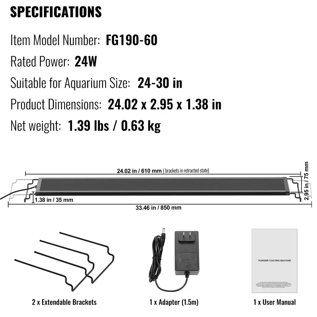 Aquarium Light Adjustable Timer And Power-Off Memory, With Abs Shell Extendable Brackets - Black - 24-30 Inch Aluminum Shell Without Display