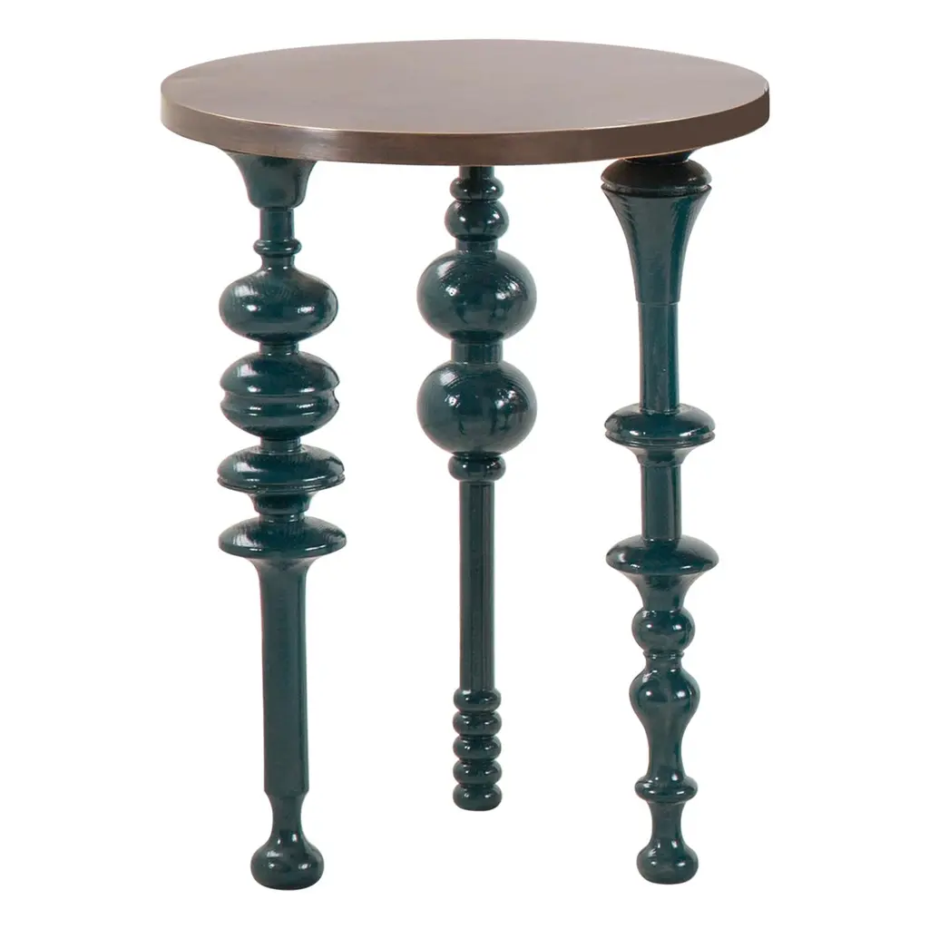 Arabesque, Inspired Lacquered Wood Side Table with Brass Top.Our Funky Fusion is a classic side table with a contemporary flare that brings character to your living space. The table is made of lacquered wood legs and a brass top, giving it an original look and feel. It’s arabesque-inspired legs nod to traditional Islamic craftsmanship. They are beautifully grooved to reflect our heritage and lacquered with a bright choice of color to add a modern twist. Can be made in blue, orange or green, matched with an oxidized or hammered brass top.