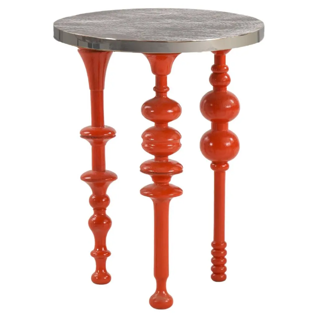 Arabesque, Inspired Lacquered Wood Side Table with Brass Top.Our Funky Fusion is a classic side table with a contemporary flare that brings character to your living space. The table is made of lacquered wood legs and a brass top, giving it an original look and feel. It’s arabesque-inspired legs nod to traditional Islamic craftsmanship. They are beautifully grooved to reflect our heritage and lacquered with a bright choice of color to add a modern twist. Can be made in blue, orange or green, matched with an oxidized or hammered brass top.