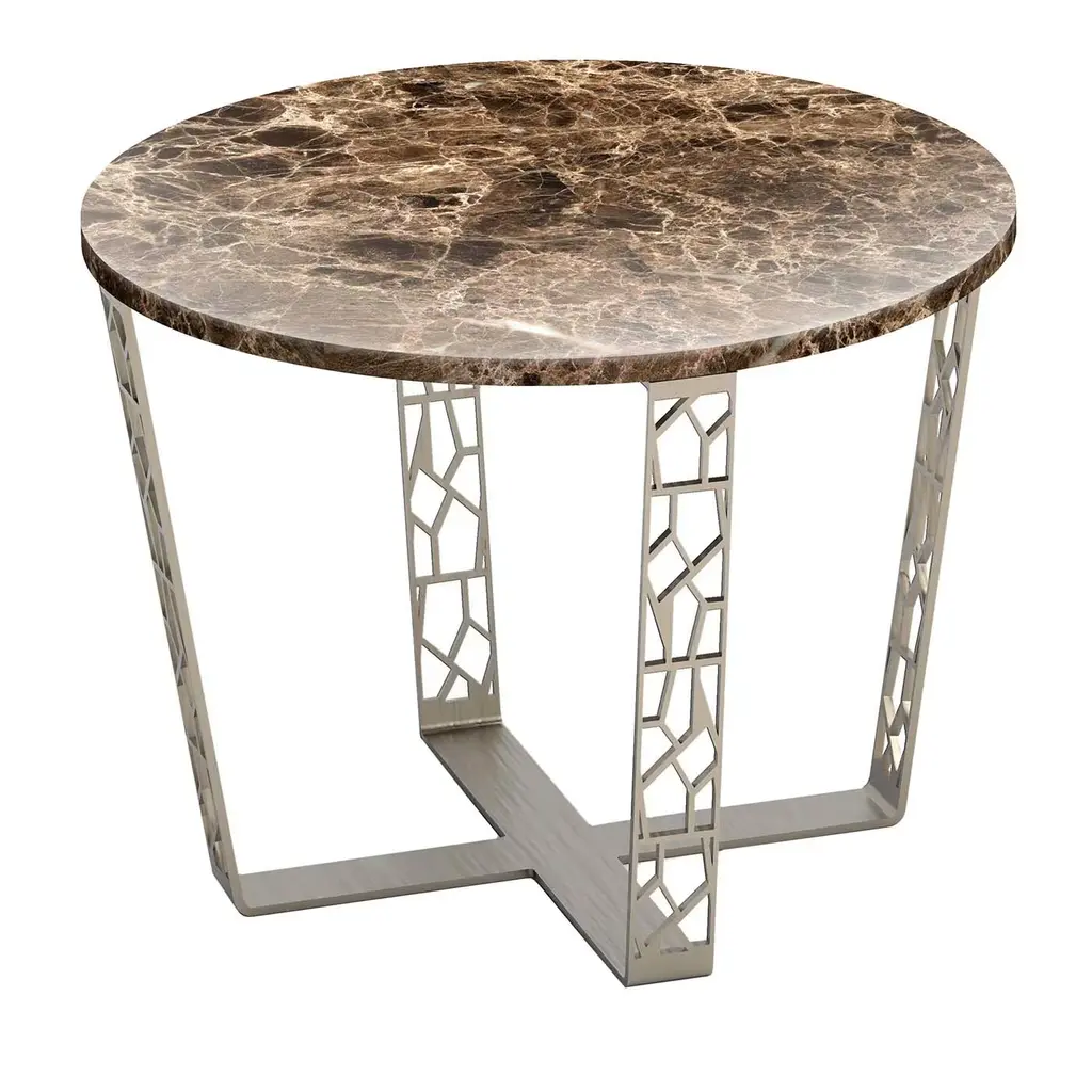 Either between two armchairs or by a sofa in the living room, this side table will add sophistication to a modern or contemporary home. The structure of this piece in metal has a bronze finish (also available in titanium) and crosses at the bottom, forming the four legs adorned by a open work with an abstract decorative pattern. This light base supports a marble top, whose light hue contrasts with the warm glow of the metal for an elegant effect. This piece is also available in cm W 47 x D 47 x H 45.