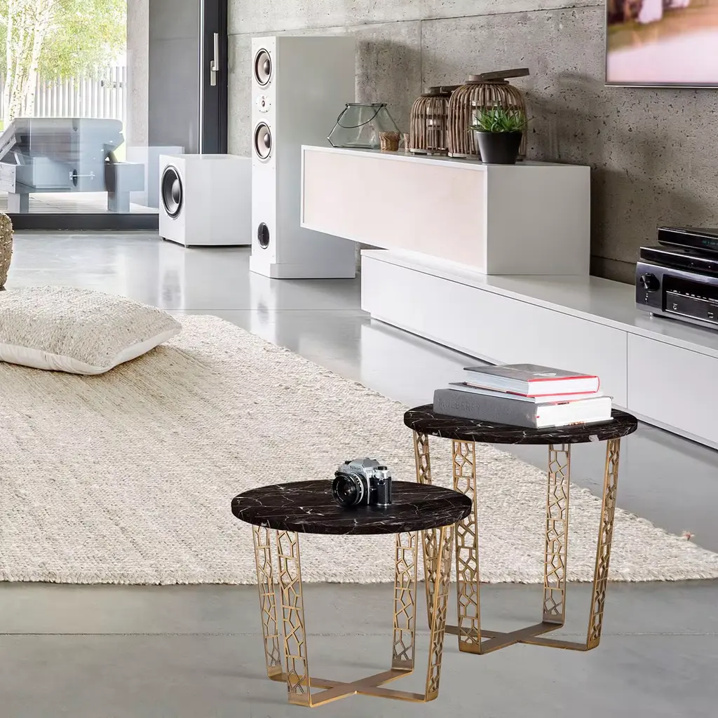 The simple silhouette of this side table is ideal for a contemporary living room, where it can be displayed alone or next to the Arabesque Low Side Table for a dynamic effect. Its round top in marble gives the piece a luxurious feel, while the crossing structure below, in metal with a bronze finish, adds a light and airy accent, thanks to the open work of its four legs with an abstract pattern. The metal finish can also be in titanium.
