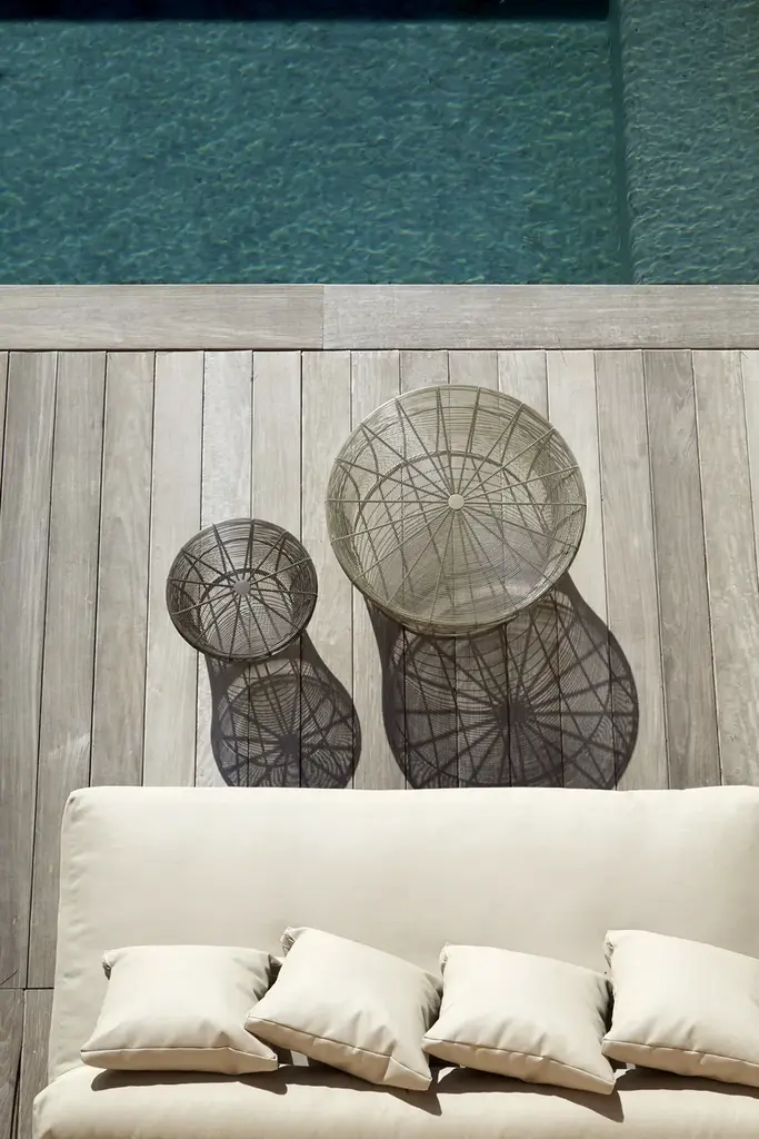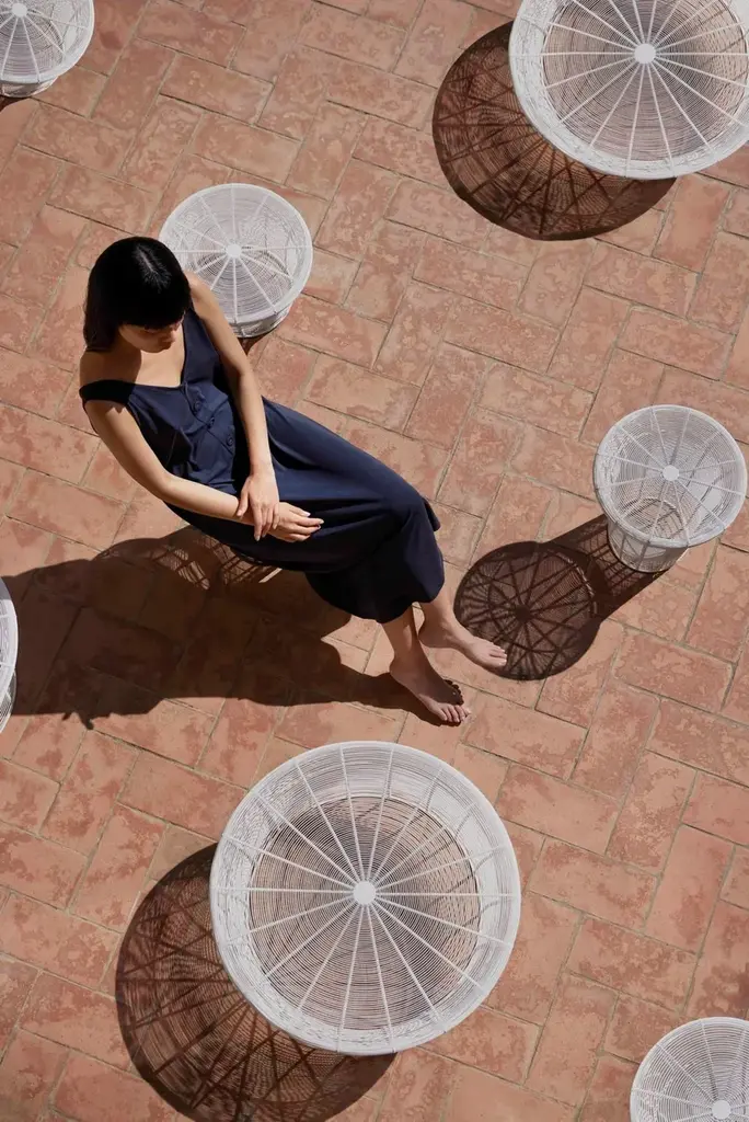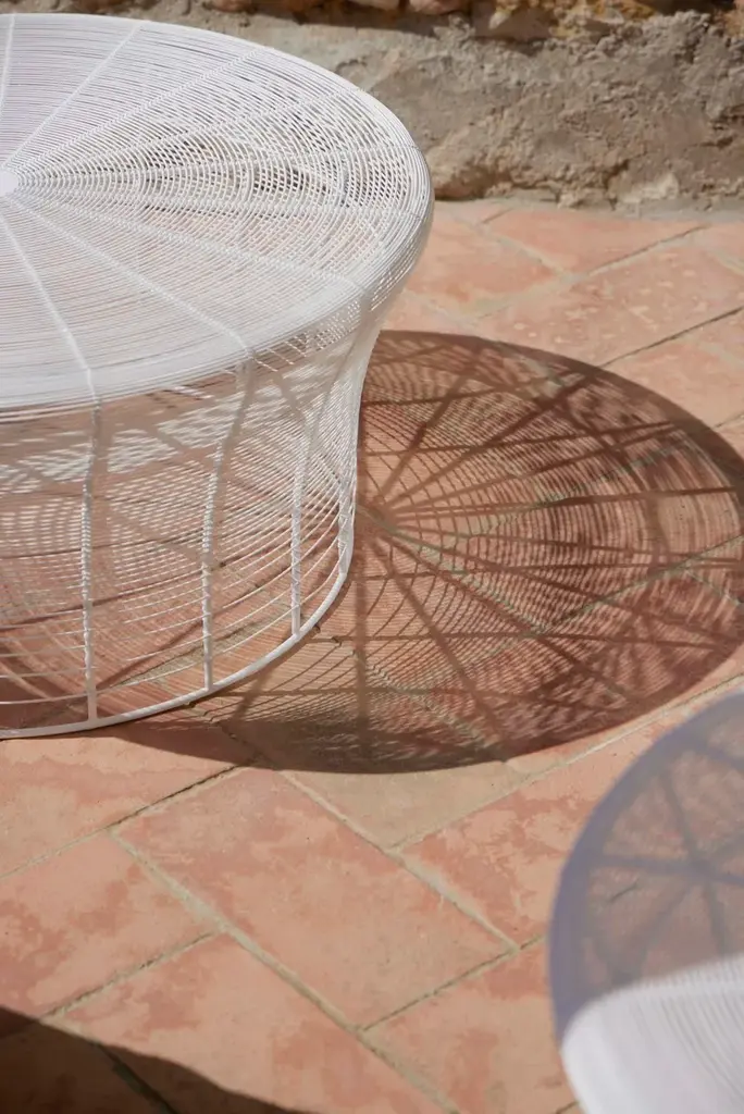 “This collection of stools and low tables is based on a traditional Indian furniture technique of weaving metal wires around a metal frame. The spacing between the wires is gradually widened, creating a gradation effect. A design created through a small change to an existing technique.”Made of thermo-lacquered stainless steel wire. Handmade.*Because they are made entirely by hand, all these items are unique.Collections colour sample: white, agate grey, cement grey, sand, bronze, wine red, blue grey, grey blue, anthracite and black.