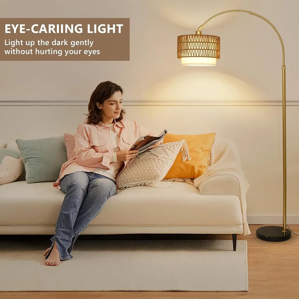 Dual Control via Remote or Foot switch: This gold floor lamp adopts a combination remote control and foot switch, assuring convenience for daily life. Adjust brightness, change colors or set different modes to DIY your desired lighting effect easily with just one tap on the remote or “Lamp Smart Pro” app without leaving the sofa and warm bed. The control range of the remote can reach 65ft, allowing you to adjust the boho floor lamps for living room without any hassle3 Color Temperatures and Fully Dimmable: The arc floor lamp for bedroom comes with a 9W LED bulb which supports stepless dimming of brightness (1%-100%) and color temperatures (3000K-6000K). With the remote, you can easily switch between 4 lighting modes (reading, feeding, working and night light modes) to meet your various scene needs. The timing function allows you to turn on and off automatically at a scheduled time, while the memory function can help you remember the last settingHeight Adjustable and Stable Base: The retractable pole allows you to adjust the height of the tall lamp from 63 inches to 72.8 inches. No need to worry about the base can not handle the weight of the corner floor lamp, 9.8 inches heavy marble base and an added widened metal reinforcement plate can prevent the rattan floor lamp from tipping over, stable and safe enough when your kids and pets are around (Please check the correct pasting method in our pictures or the instruction manual)Standing Lamp with Double Drum Shade: Our farmhouse floor lamp comes with a woven rattan and linen lampshade, has 3 display effects. Update the look of the mid century modern floor lamp at any time simply by combining the lampshades optionally; the 2 in 1 rattan and fabric shade design allows you to enjoy the diversity of home decor, effectively protect your eyes, and create a more warm atmosphere.