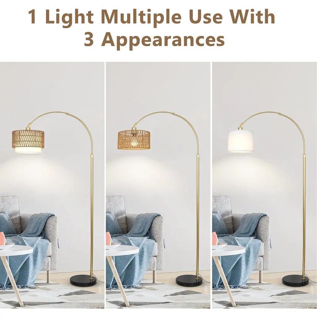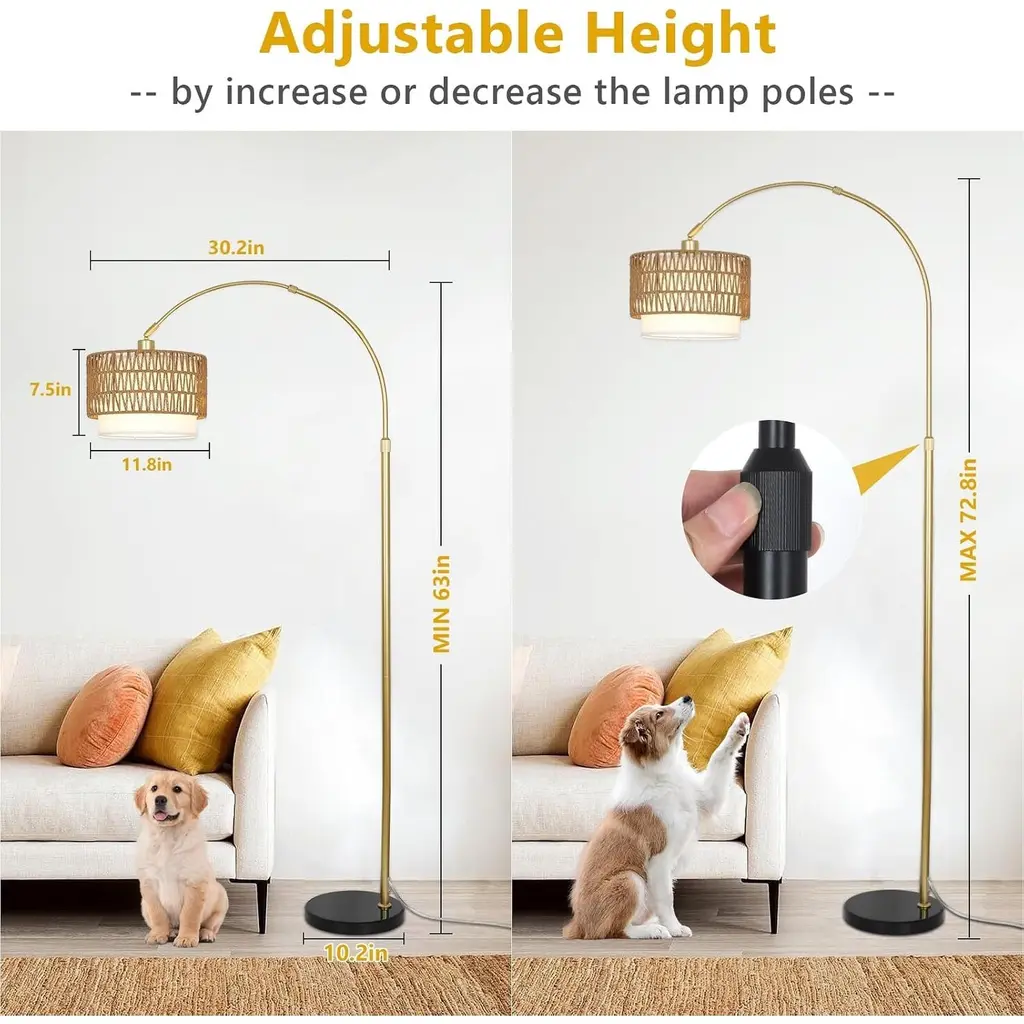 Warm tips: Product after-sales guide 🚀Thank you for purchasing our products!Please do not return the product in case of problems. Please take a photo and send it to us, we will quickly process and provide a reasonable solution. Thank you for your cooperation! 🙏Dual Control via Remote or Foot switch: This gold floor lamp adopts a combination remote control and foot switch, assuring convenience for daily life. Adjust brightness, change colors or set different modes to DIY your desired lighting effect easily with just one tap on the remote or “Lamp Smart Pro” app without leaving the sofa and warm bed. The control range of the remote can reach 65ft, allowing you to adjust the boho floor lamps for living room without any hassle3 Color Temperatures and Fully Dimmable: The arc floor lamp for bedroom comes with a 9W LED bulb which supports stepless dimming of brightness (1%-100%) and color temperatures (3000K-6000K).With the remote, you can easily switch between 4 lighting modes (reading, feeding, working and night light modes) to meet your various scene needs. The timing function allows you to turn on and off automatically at a scheduled time, while the memory function can help you remember the last settingHeight Adjustable and Stable Base: The retractable pole allows you to adjust the height of the tall lamp from 63 inches to 72.8 inches. No need to worry about the base can not handle the weight of the corner floor lamp, 9.8 inches heavy marble base and an added widened metal reinforcement plate can prevent the rattan floor lamp from tipping over, stable and safe enough when your kids and pets are around (Please check the correct pasting method in our pictures or the instruction manual)Standing Lamp with Double Drum Shade: Our farmhouse floor lamp comes with a woven rattan and linen lampshade, has 3 display effects. Update the look of the mid century modern floor lamp at any time simply by combining the lampshades optionally; the 2 in 1 rattan and fabric shade design allows you to enjoy the diversity of home decor, effectively protect your eyes, and create a more warm atmosphere.