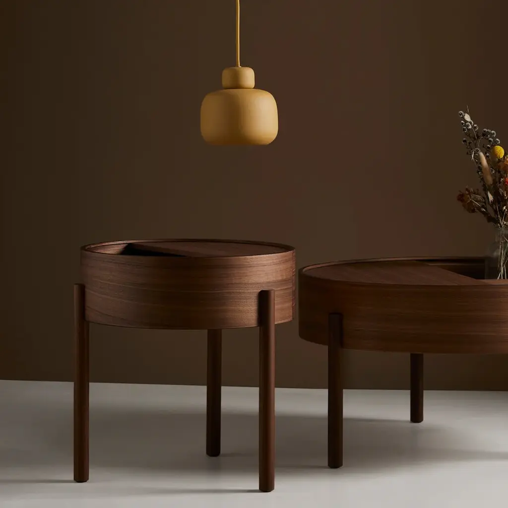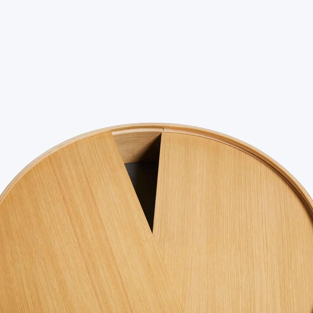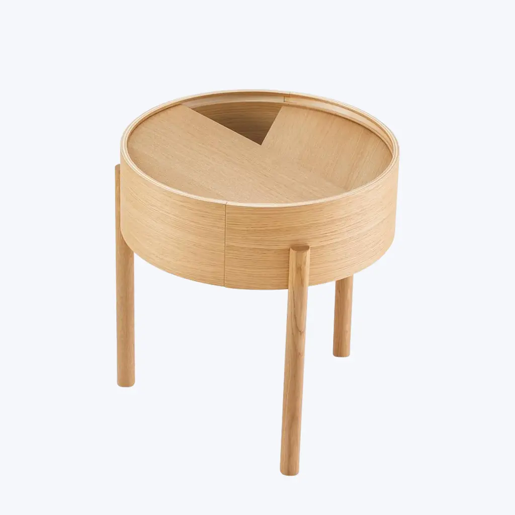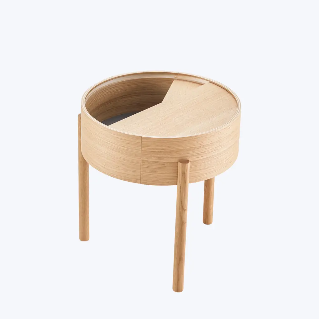 Discover the Arc Side Table by WOUD. Designed by Ditte Vad and Julie Begtrup, this elegant Scandinavian piece is inspired by the mathematical concept of a smooth curve joining two points on a circle. Rotate the circular lid to change the table’s aesthetic expression. Choose from Oiled Oak and White Pigmented Oak finishes.