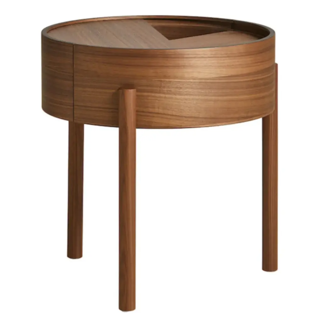 ARC takes its name from the mathematical concept of a smooth curve joining two points in a circle. The ARC table invites its user to make use of the simple functionalities, use one finger to turn the upper tabletop. Let it be open with your favourite objects on display or close the lid to hide your mess. The surface on the inside storage space is covered with a smooth nanolaminate to complement the ash wood while the three-legged construction adds a playful and light touch to the geometric shaped design.