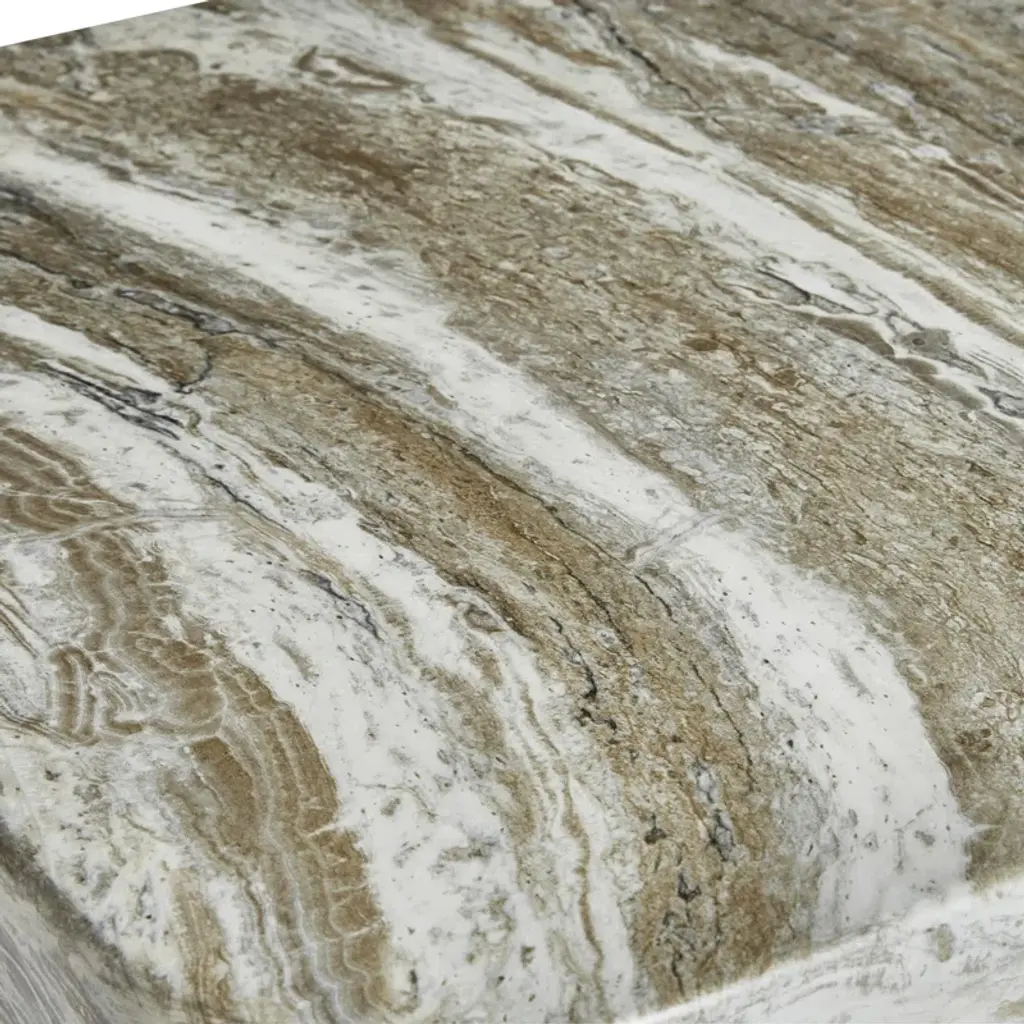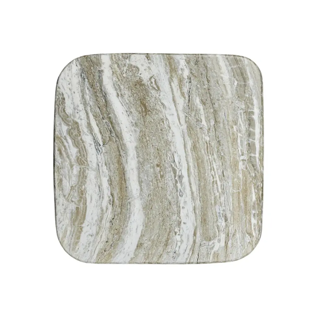 Totemic shapes support the top of the Arcadia side table for a beautiful modern primitive look. A faux stone table top supported by two organic-shaped legs offers lovely striations in a kalta finish.