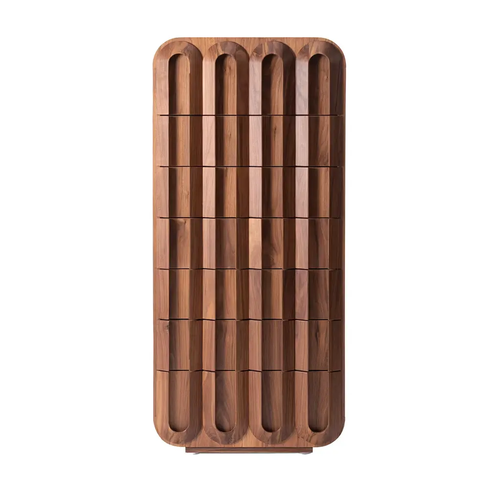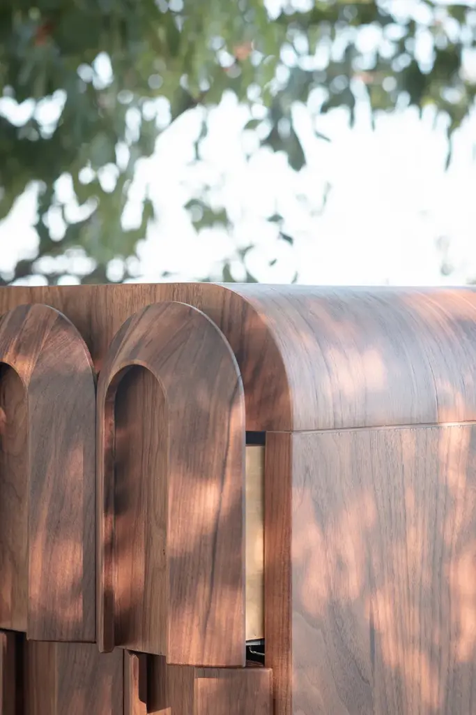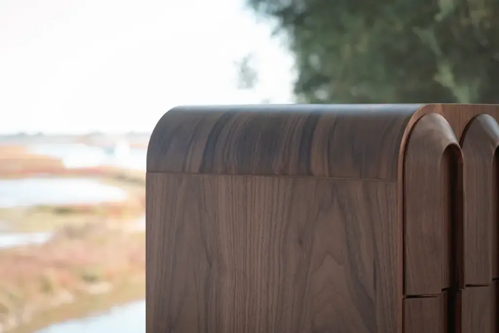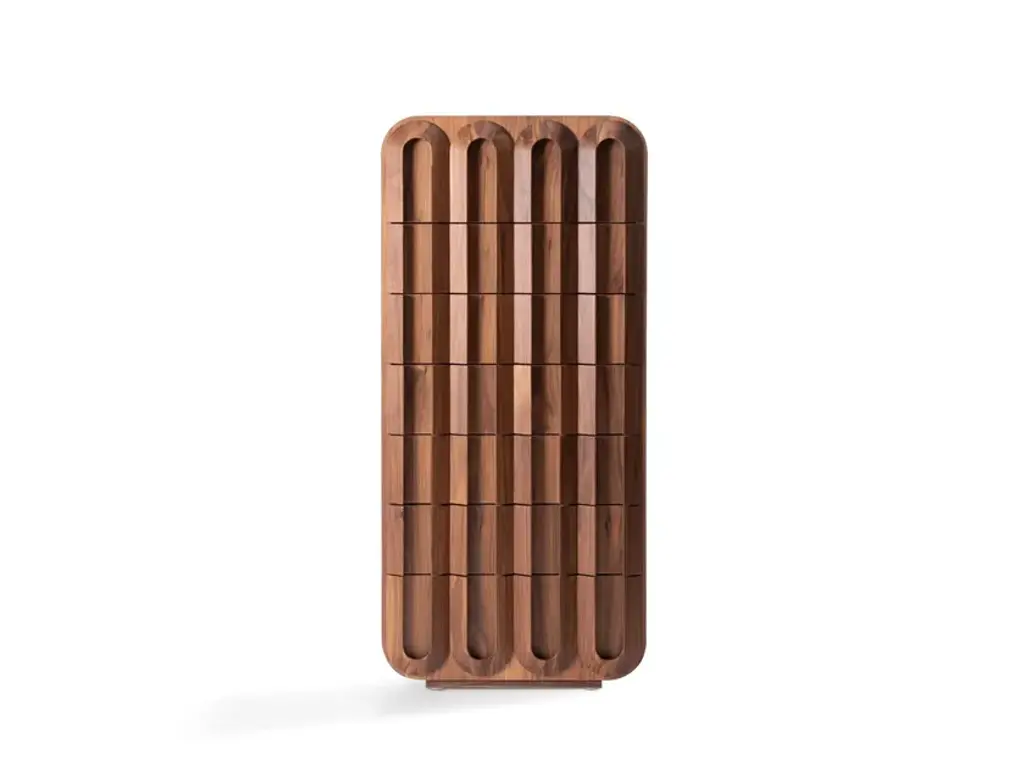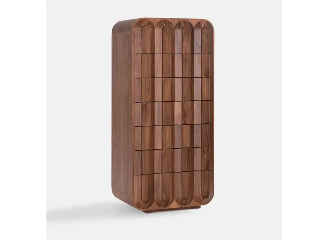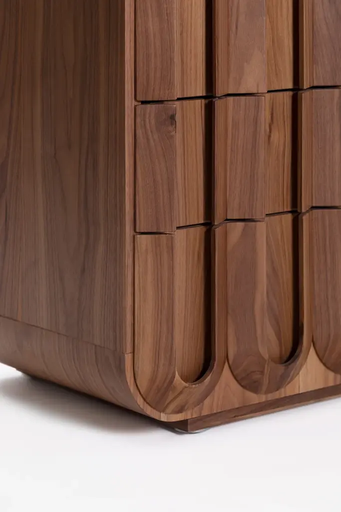 Arcate is a chest of drawers in solid wood with integrated handles.Santa Fosca church, the Torcello and Murano basilicas: in an austere architectural style, the refined lightness of the arches which follow on from each other at a constant rhythm. The smaller islands of the lagoon and its Romanesque buildings.The curved and straight lines, the solids and voids, the austerity and lightness; and, above all, the refined lightness of the arches which follow on from each other at a constant rhythm. The Arcate collection of furniture represents a stated homage to one of the essential architectural elements – the arch in its typical variation of Romanesque constructions, present in various areas of the Veneto region such as some of the smaller islands of the Venetian lagoon – consisting of seven-drawer chests, dressers and bedside tables. It is a family of furniture with vibrant surfaces and a strongly architectural vocation, designed by Milanese studio AccardiBuccheri –Mauro Accardi and Silvia Buccheri, architectural designers, designers and artistic directors of the brand – for MEDULUM.The constant alternation of a series of arches thus defines the geometry of Arcate: solid wood elements, skilfully milled with mastery of the manufacturing process, create a system of recesses and handles which mark out the surface, while remaining apparently invisible.The use of canaletto walnut amplifies the sculptural nature of these objects, emphasised by the particular design of the handles, which reveal a further, important characteristic: the presence of large drawers to emphasise the highly functional vocation of the collection.MATERIALSCurved plywood veneered, solid wood.FINISHES01. Oak02. Canaletto walnut03. Italian walnut04. Black painted open-pore ash