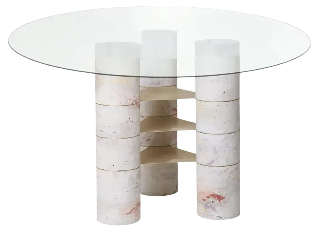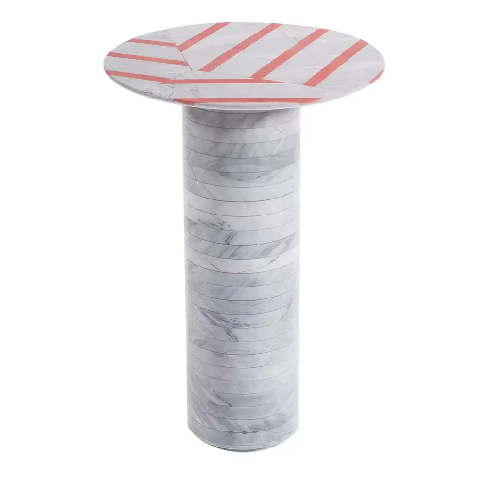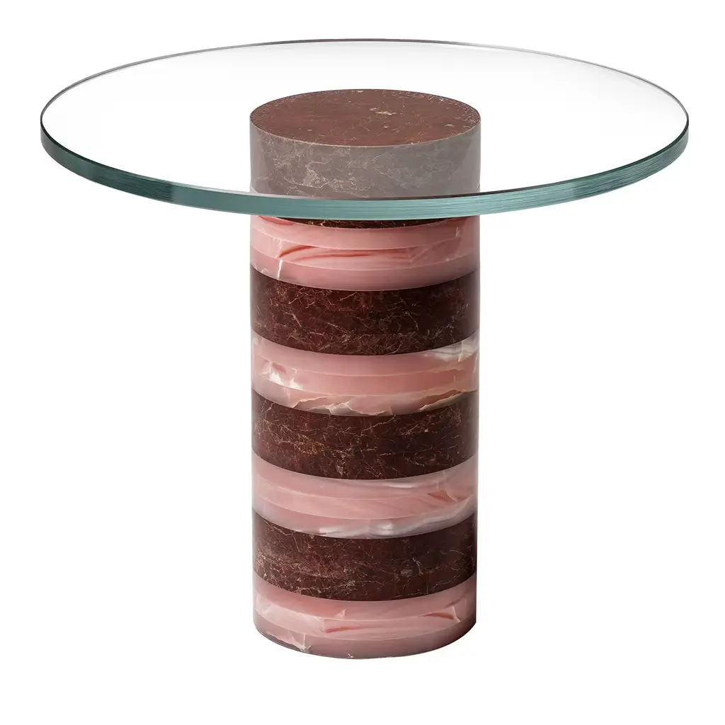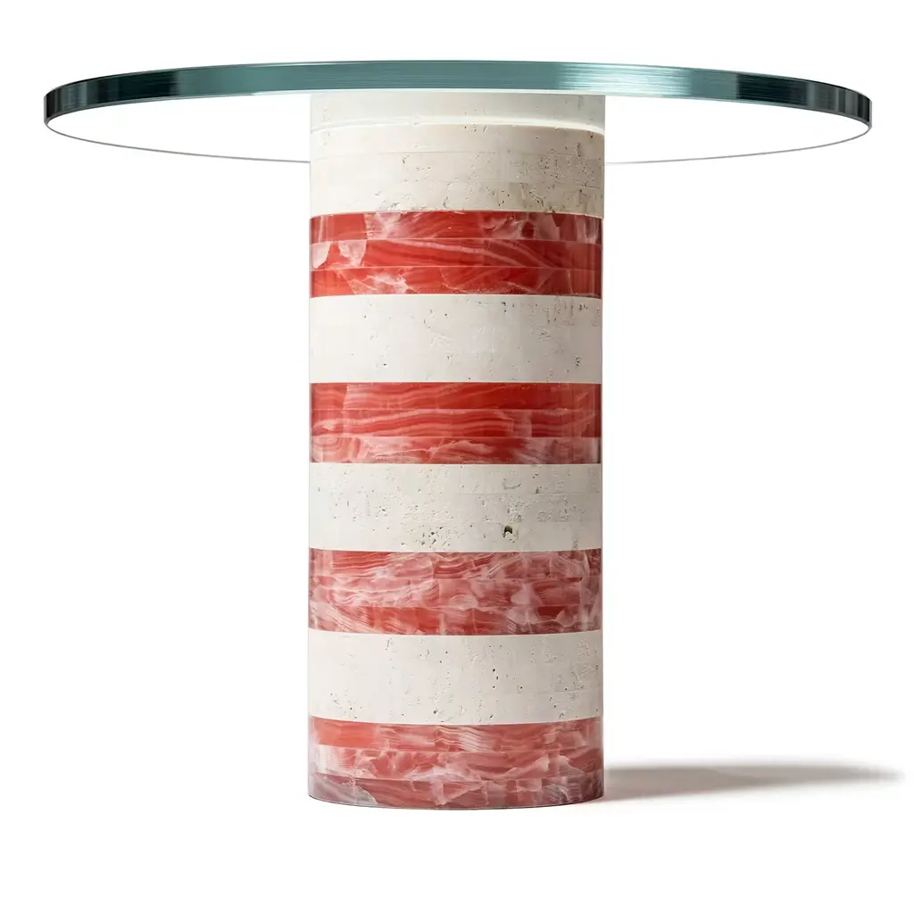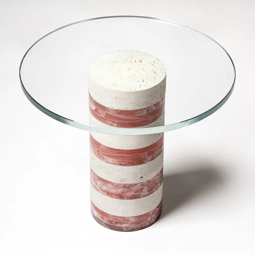 Architexture Side Table in sandblasted and open-pore Classic Roman Travertine and Coral Aquarel Onyx. The cheerful Side Tables of the Architexture collection, with a circular top in extra-clear glass and column legs, feature nuances of bright colors. Versatile and easily combinable with the other shapes of the same collection, they become absolute stars of space.