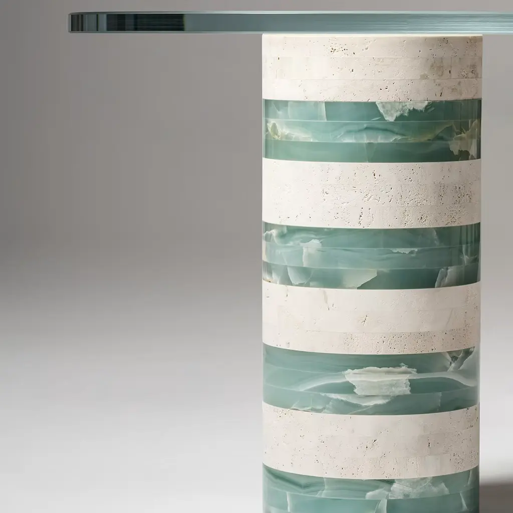 Architexture Side Table in sandblasted and open-pore Classic Roman Travertine and Mint Aquarel Onyx. The cheerful Side Tables of the Architexture collection, with a circular top in extra-clear glass and column legs, feature nuances of bright colors. Versatile and easily combinable with the other shapes of the same collection, they become absolute stars of space.
