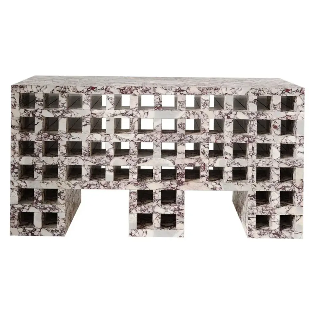 Archive side table by cara davide materials: calacatta viola dimensions: h 38 x w 30 x d 74cm 2021 archivio is a small occasional table constructed from a single sheet of archived calacatta viola marble. The project was developed with the italian brand, mille997, who opened up their archive, allowing studio cara davide to browse their vast collection of prestigious marbles and natural stone. The idea was to repurpose the archived material, transforming it into an object using few and simple technologies. For this reason, the sheet is sliced into smaller pieces and reassembled in a way that creates a volumetric presence through a graphic display of solids and voids. Design studio based in milan, is a collaboration between cara judd (south africa) and davide gramatica (italy). This piece is attributed to the mentioned designer/maker. It has no attribution mark and no official proof of authenticity, however it is well documented in design history. I take full responsibility for any authenticity issues arising from misattribution