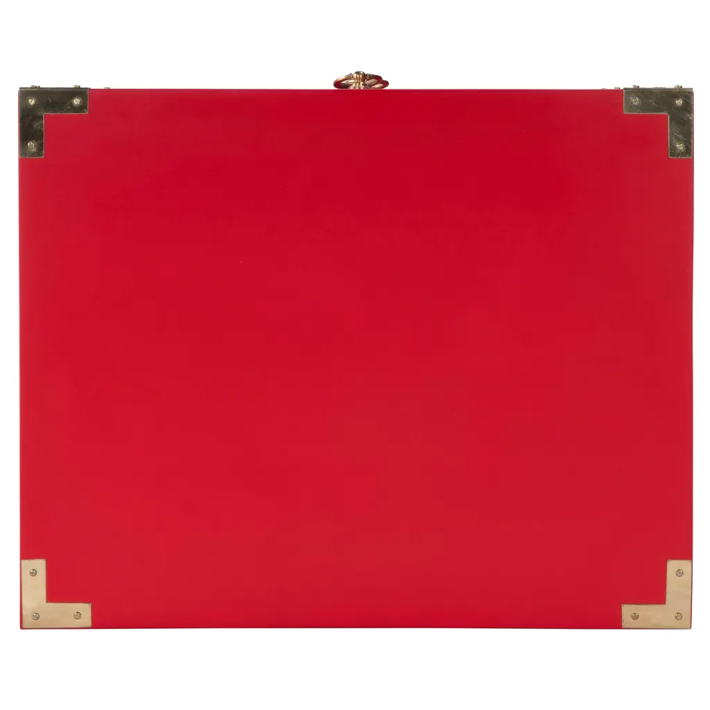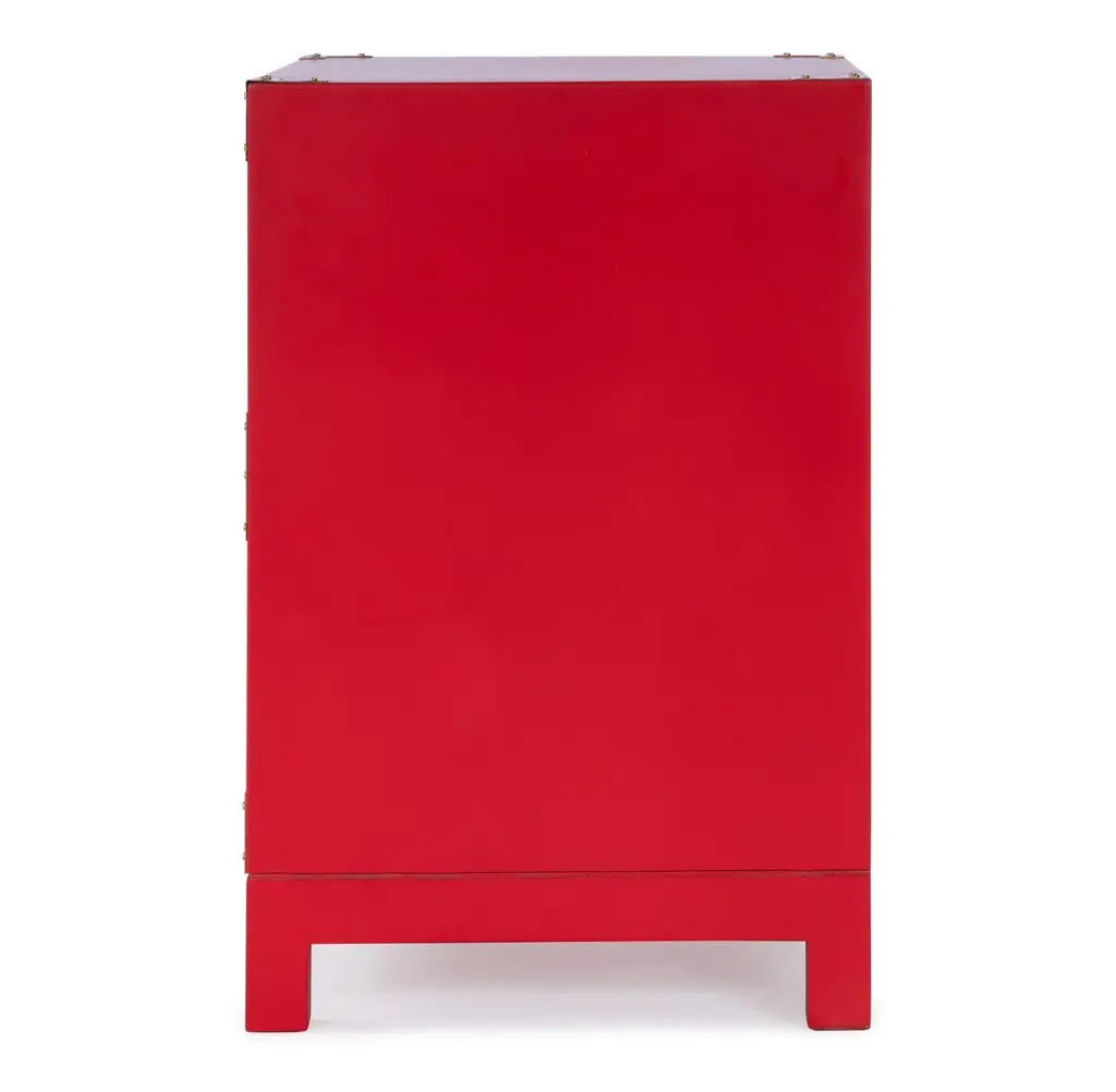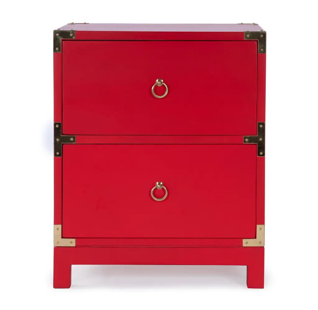 This striking campaign-inspired Chairside Chest is sure to be the focal point of any living room or bedroom. Crafted from mango Wood solids and Wood products, it boasts a bold red finish and two storage drawers with brass ring pulls and matching corner hardware. Durably Constructed With: Mango Wood Solids, MDF, Brass Product Construction Features: Wood Slide,No,Finish Distressing Product Assembled Measurement & Weight: 24.0" H x 20.0" W x 16.0" D -- 33.0 lbs. 80 lbs. Suggested weight capacity Item Arrives: Assembled Variations in shade and markings are normal and can be expected with the natural materials used in the construction of this product. Photo may slightly differ from actual item in terms of color/finish due to the lighting during photo shoot or the monitor's display.