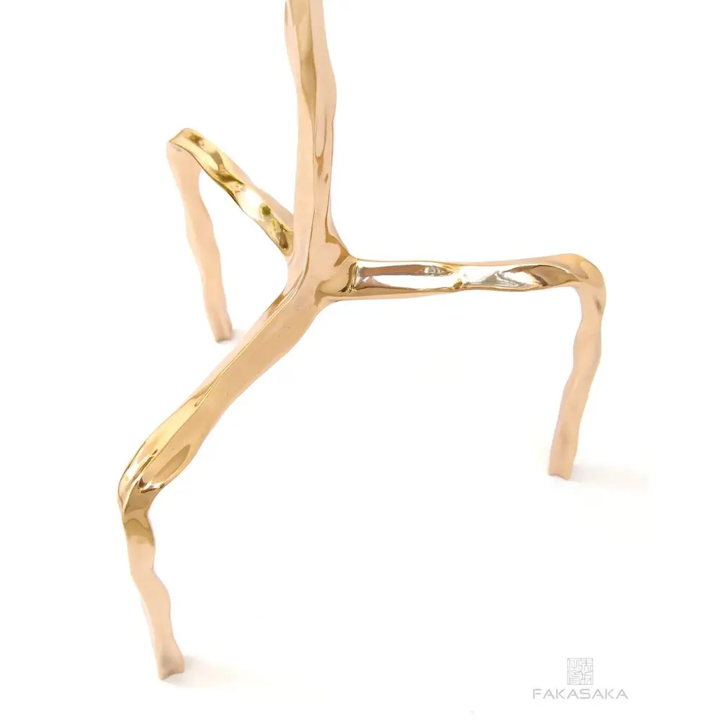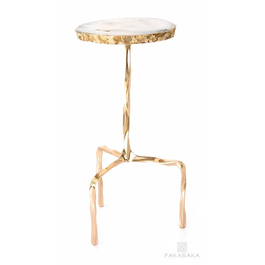 Aretha drink table with Agate top by Fakasaka Design.Dimensions: W 30 cm D 30 cm H 58 cm.Materials: polished bronze base, Agate top. Also available in different table top materials:Nero Marquina Marble Marrom Imperial MarblePedra AgateOnyx FAKASAKA is a design company focused on production of high-end furniture, lighting, decorative objects, jewels, and accessories. Established in 2007, Fakasaka is the eponymous design company by Brazilian artist Fernando Akasaka distinguished by a penchant for producing intricate detailed cast bronze collectible design objects, furniture and jewelries. Fakasaka explores the contrast between the manmade and the natural through shapes and finishes that create a clear aesthetic. The constant challenge to balance elements is met with an outcome that is a striking assortment of bronze furniture and objects in oxidised and polished finishes, accented with precious regional stones, granites and rich prehistoric reptilian motifs.