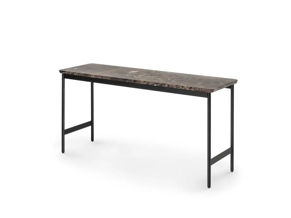 Arflex Capilano Small Table in Emperador Marble Top by Luca Nichetto. Supported by a light and elegant metal structure, Capilano's series of small tables takes its name from the Capilano Suspension Bridge in Vancouver. Originally developed to complement the Papoose sofa, designed last year, Capilano is a stand-alone series of small and side-tables available in two different configurations: triangular and rectangular. While the frame is metal, the tabletop is made a high-tech ceramic tile, with a smooth and resistant surface.Additional Information:Materials: Emperador Marble Top and Black Lacquered MetalDimensions: W. 96 x D. 30 x H. 48.5 cmAvailable in other size options: W. 75 x D. 55 x H. 48.5 cm, W. 187.5 x D. 30 x H. 48.5 cmAvailable in other top options: Emperador, Guatemala marble, Fondovalle LavaAvailable in other options for lacquered version: Gold