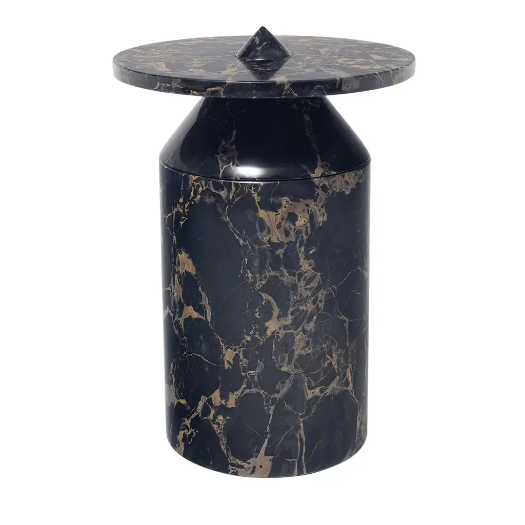 A beautiful concrete side table stocked in a black marble look finish. A versatile and functional piece