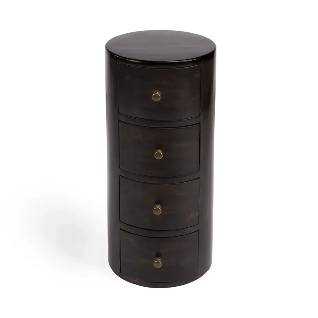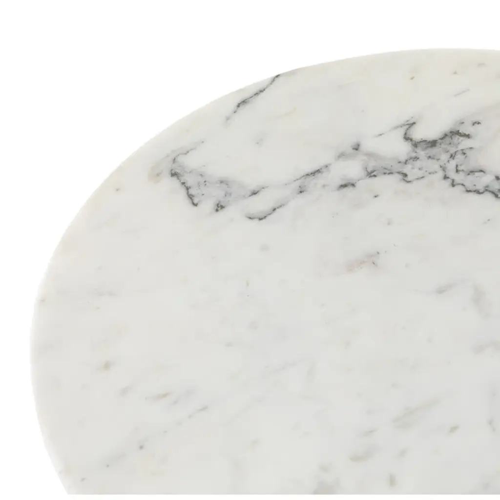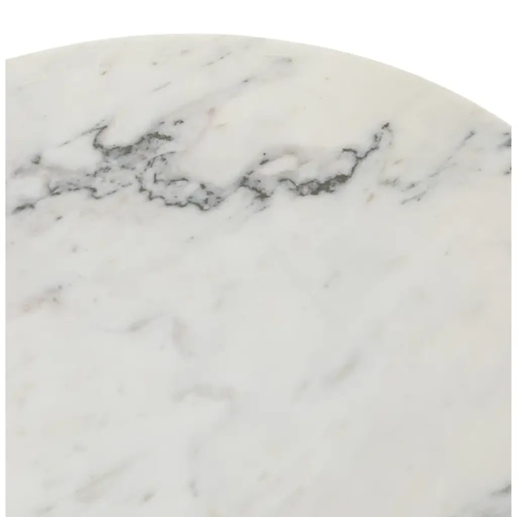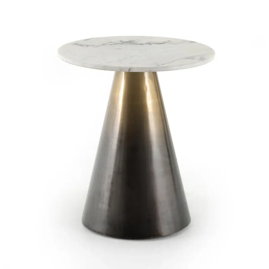 Layer in a little elegance. A shapely cone iron base features an antique brass finish, creating an ombre-like look, while a rounded white marble tabletop flaunts charcoal veining for true beauty.