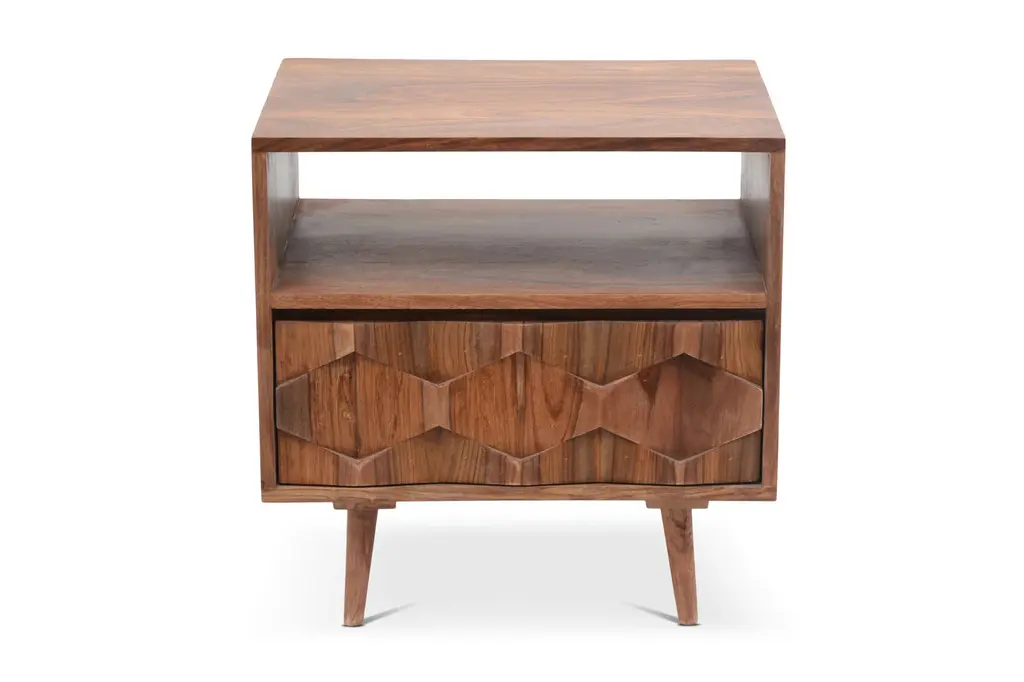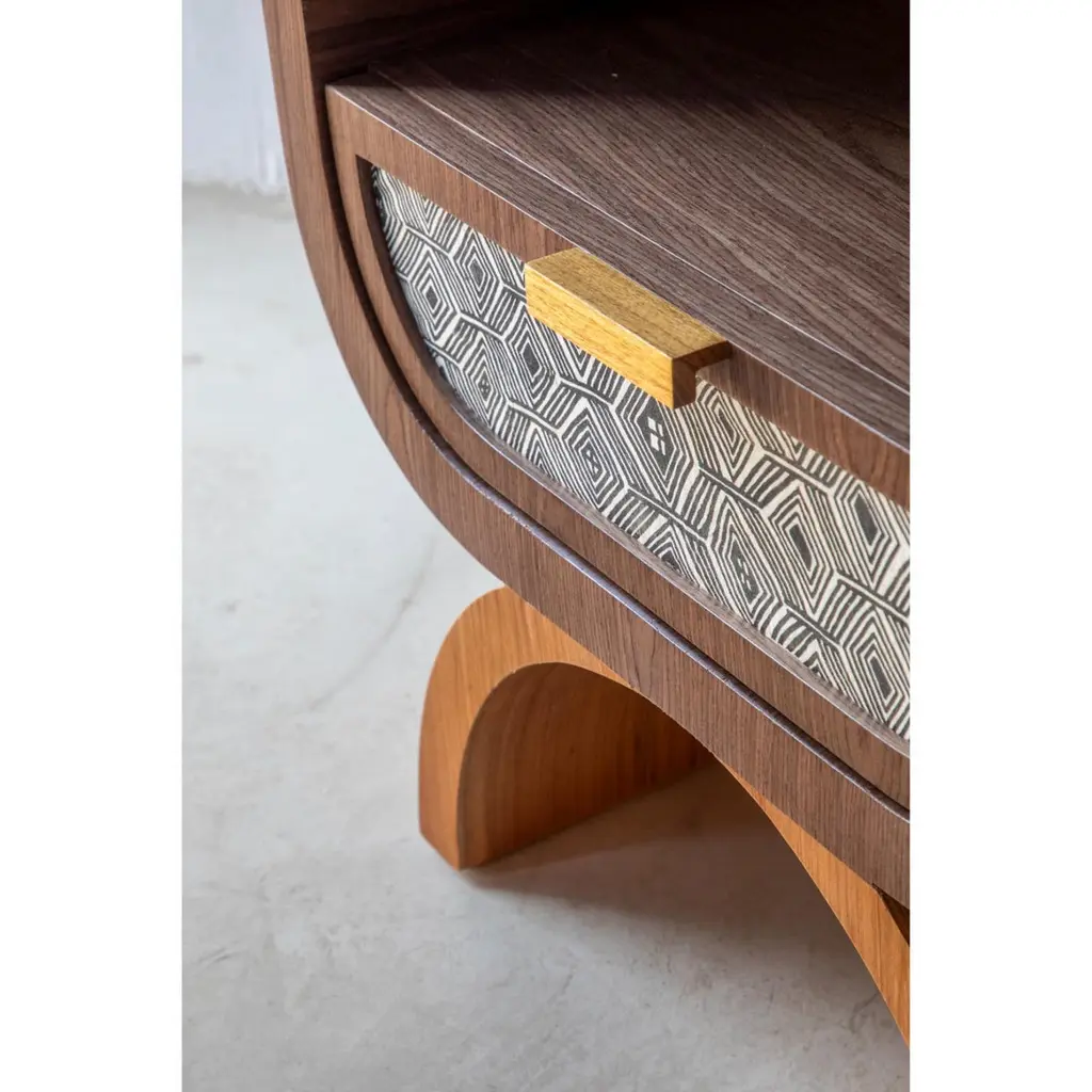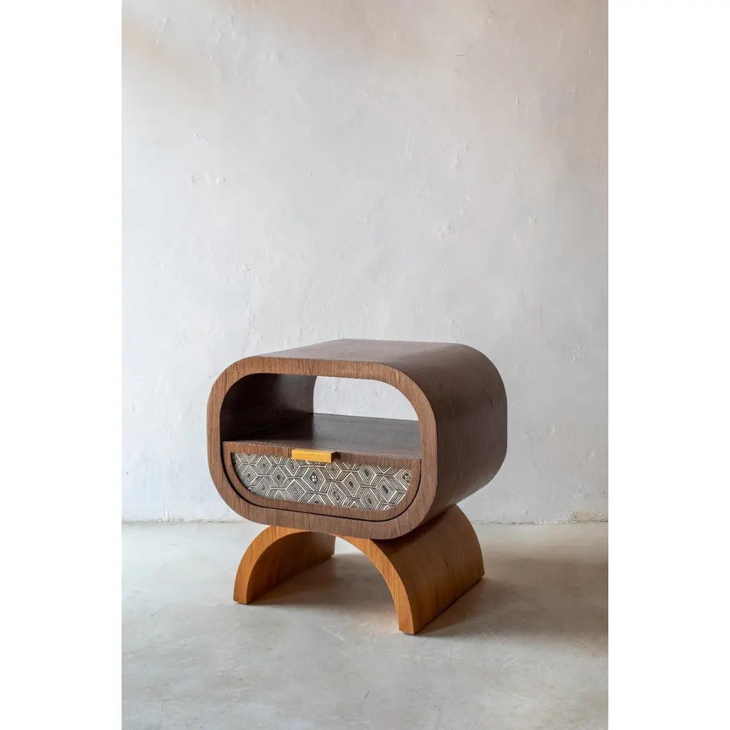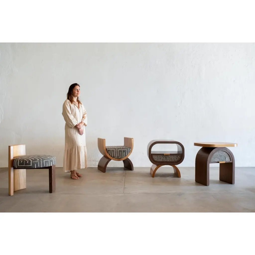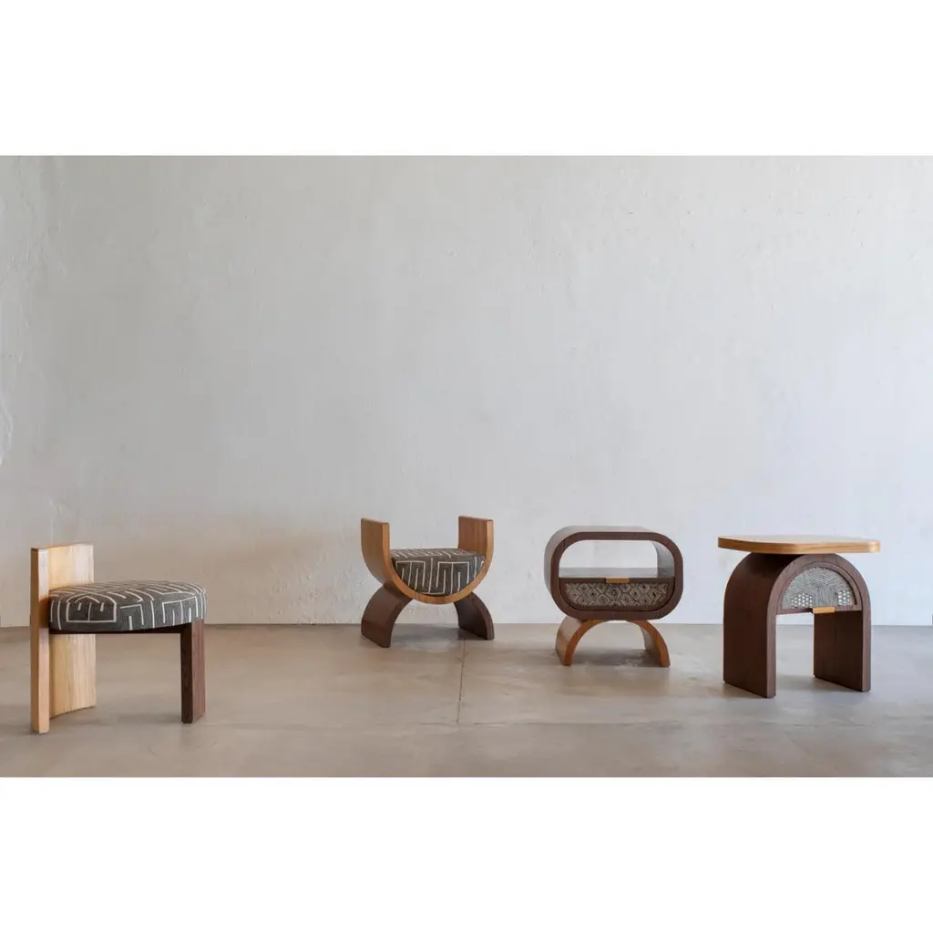 Aro Side Table by Gabriela CamposDimensions: D 45 x W 60 x H 60 cm.Materials: Freijó wood with imbuia finish and hand-painted fabric.The essence of this capsule of 4 pieces is a dialog between the Art Décomovement and the indigenous graphics of the Assurini people from theUpper Xingu region of the Amazon. A contemporary look at ancestral tradition, using the geometric aesthetics of the art movement and the application of hand-painted fabric, by Assurini women.Through this union we created a unique visual identity that celebratesour cultural and creative diversity.ESTÚDIO MAIS ALMA moves toward the authentic and the unique, whether in the subtle observation of nature's forms and contours, or in the inexhaustible source of inspiration that is the world of art.Mais Alma is a design studio BASED in Rio de Janeiro, founded by architect and designer Gabriela Campos. Her work has a contemporary and welcoming approach: a comfortable and timeless aesthetic that combines warm materials and clean lines, with soft palettes and finedetails.