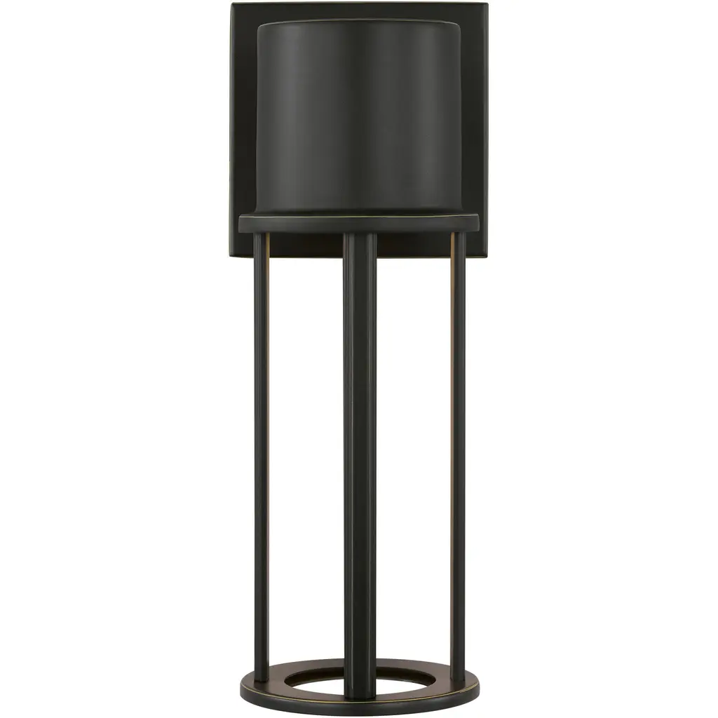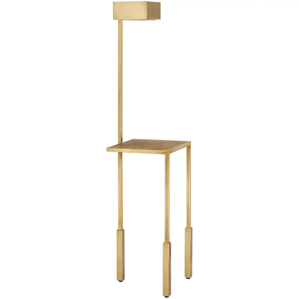 A light source and side table in one, the Arona Floor Lamp is designed for minimalist living spaces. On a burnished brass base, the table features a smoky glass top for a chic effect. The lamp extends from the center of the back of the table and is topped with a square shade. \nBulb 1 x E27.