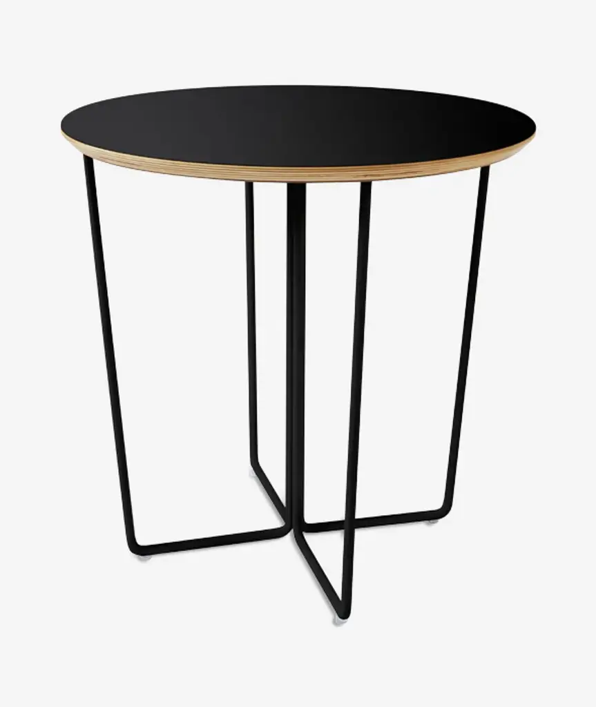 The Array End Table features an elegant, geometric base that repeats around a central axis to create a contemporary accent design. The circular top has a beveled, exposed-ply edge and a durable, laminate surface.