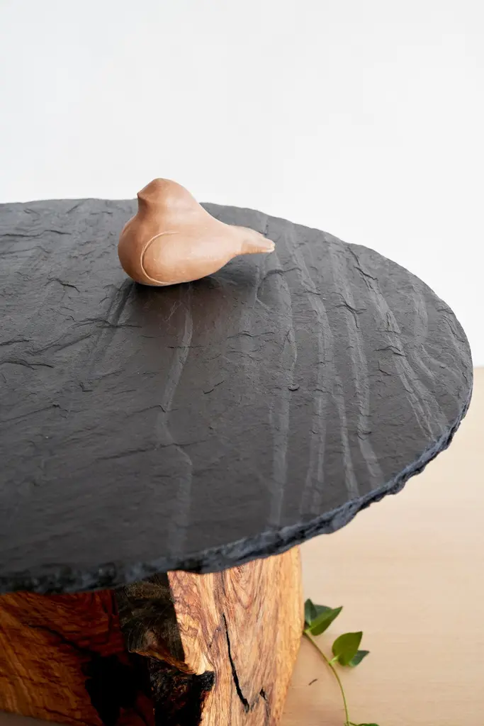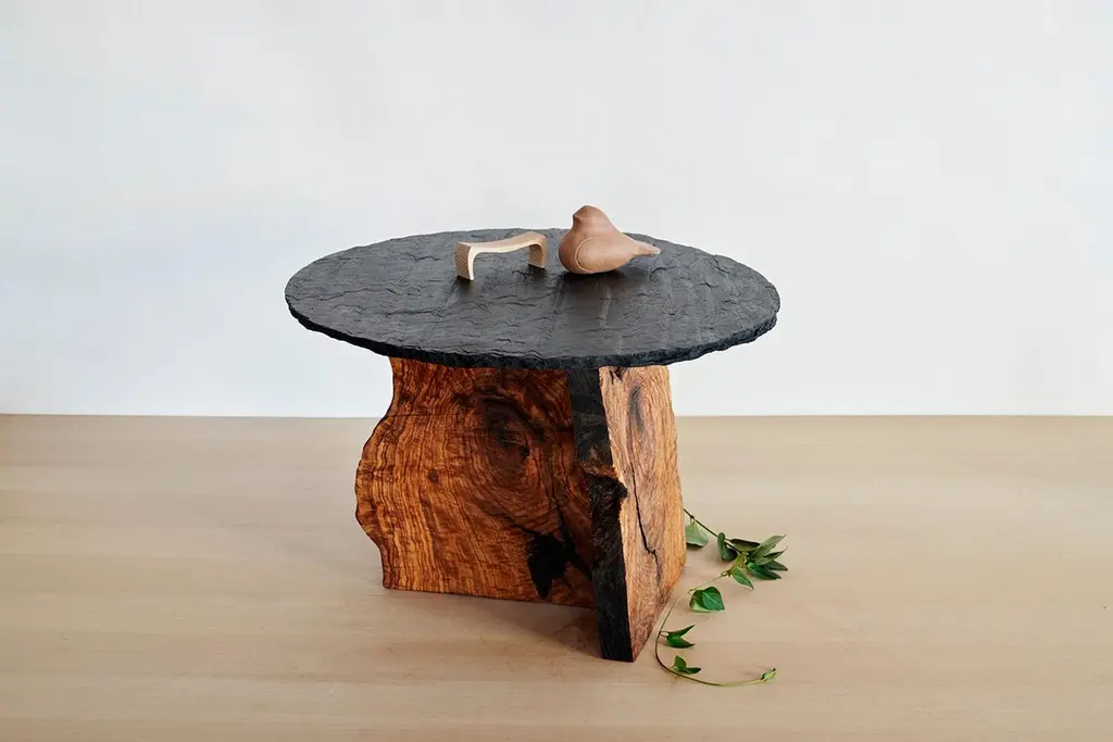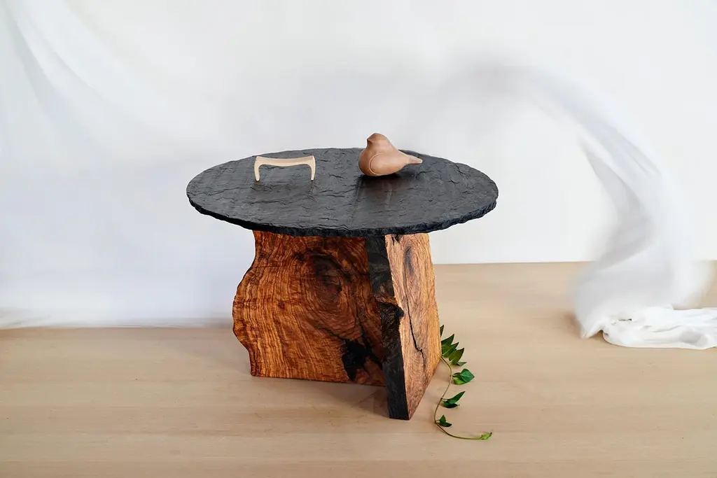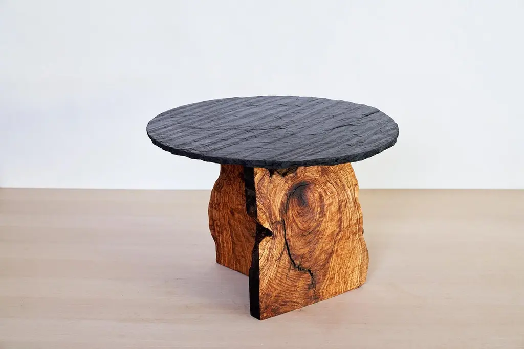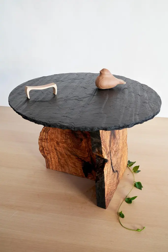 Art Brut Center Table by Jean-Baptiste Van Den HeedeUnique pieceDimensions: D 60 x H 41 cmMaterials: Natural olive wood and Slate stone.Living room table from the ART BRUT collection. A functional sculpture that can be seen as a side table as well.Jean-Baptiste Van den Heede defines himself as a cabinetmaker-designer and an artist of academic training and family tradition. He has achieved unique designs of national and international prestige and has several awards in avant-garde furniture.Born in Argentina in 1966, from an Argentine mother and a Belgian father. At 5 years of age he and his family moved to Belgium.To train as a wood professional, he first studied 4 years of carpentry. Then he continued training in cabinetmaking and carving for 5 more years. Always in search of contributing something more to his trade, he studied furniture and antique design, culminating this with the study of Sculpture at the Royal Academies of Fine Arts in Liège (Belgium) and graduating with honors.Work the stone, the wood and experience the forge. From the beginning it is directed towards a search for signs, abstract writings and unrealistic figures in analogy with other “primitive” cultures. He taught drawing and sculpture in Brussels at the private school “la main et l´ esprit” As well as summer courses in Liege (Belgium) “les ateliers d´art contemporain”.In 1995 he went to Barcelona where he taught and investigated the reliefs of different supports such as trees, floors, and especially sewer covers.He searched again analogies between current art and prehistoric, African art, etc.Participated in several exhibitions both at the artistic level and avant-garde design.In 2002, he moved down to Albacete and then to a town in the province where he still works.It is defined as “a search engine without haste or guidelines.” He says: “I only work when I feel a strong and positive inspiration invade me, an energy that I capture from matter, from the air and that I return doing the work until I feel a connection with it.”Private workshop of contemporary art in Letur (Albacete) until 2009.He currently works in his workshop-studio in the Sierra de Madrid (Guadalix de la Sierra) following his career as a cabinetmaker-designer and artist while teaching his trade to students interested in wood.
