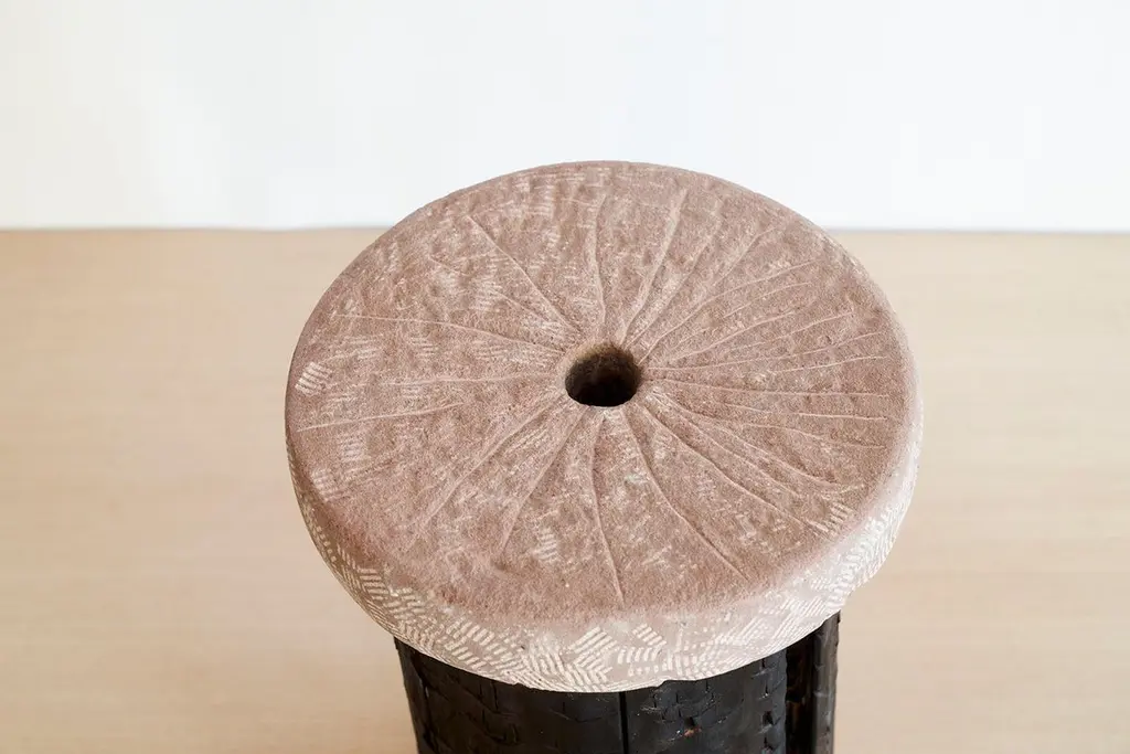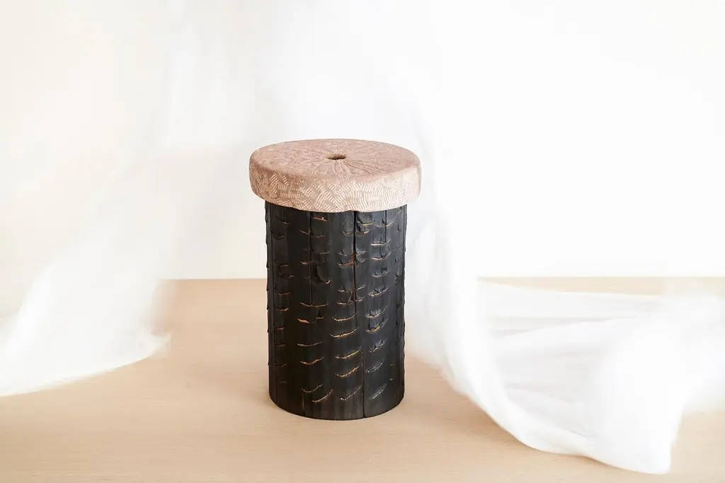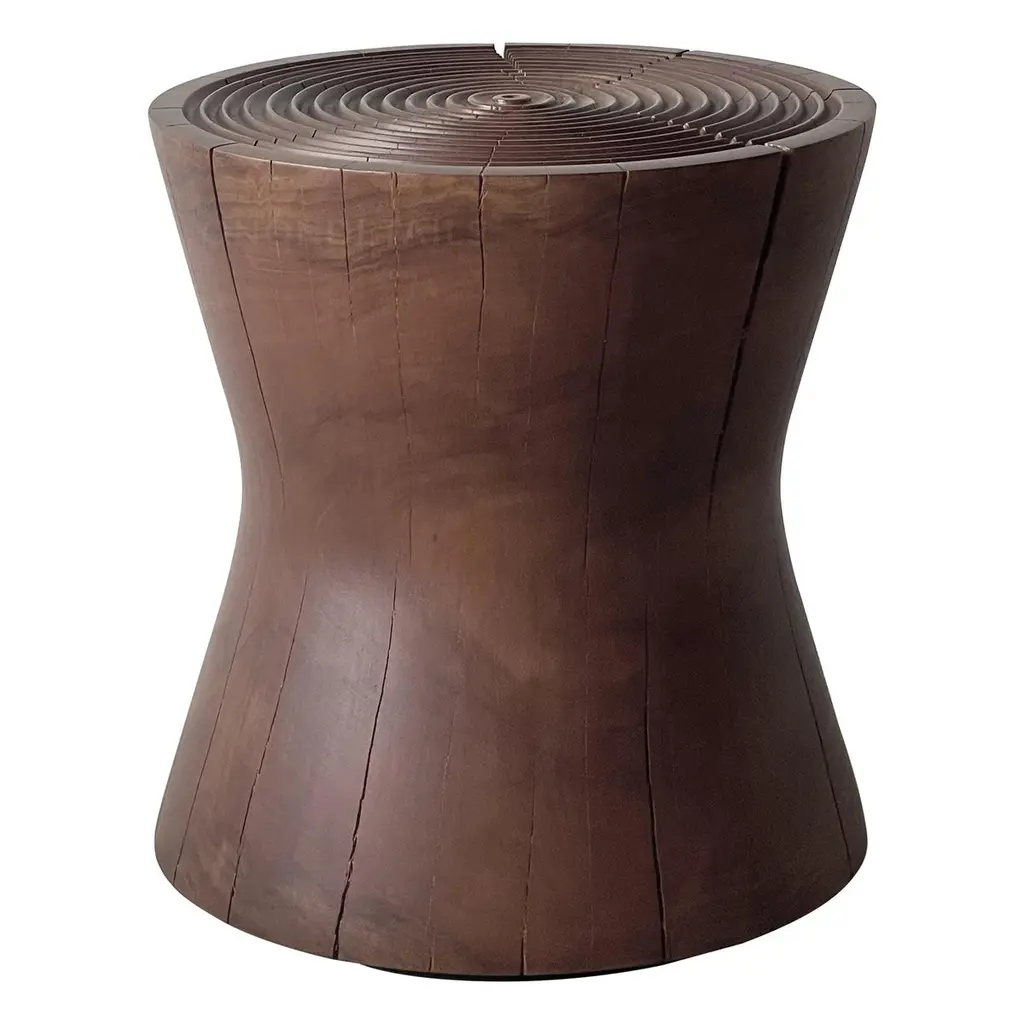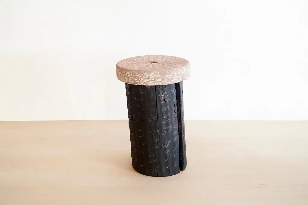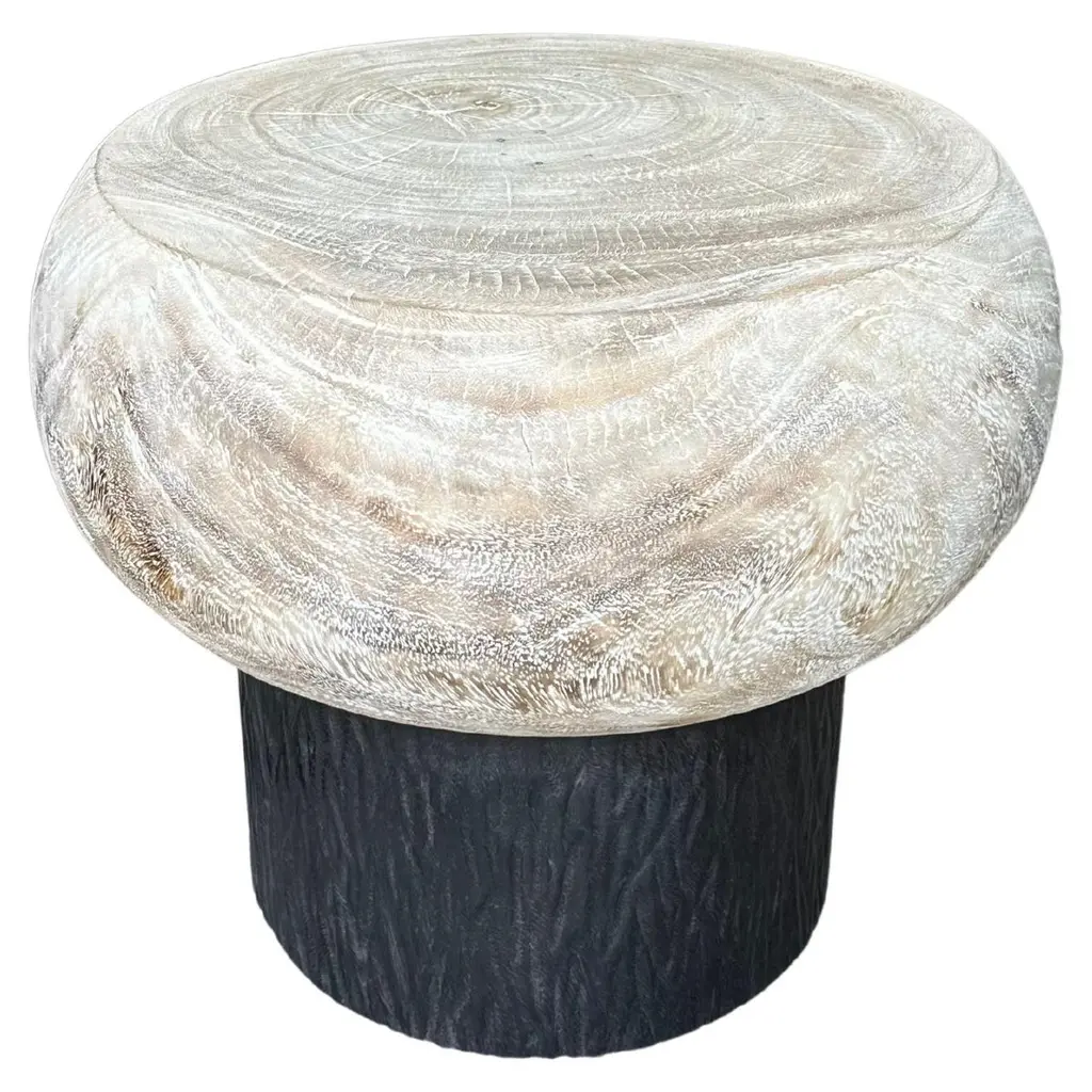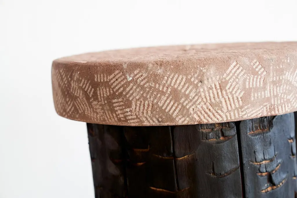 Art Brut Side Table by Jean-Baptiste Van Den HeedeUnique pieceDimensions: D 44 x H 28 cmMaterials: Hand-carved stone and Fire-Treated Wood.Functional sculpture, side table from the ART BRUT collection. Jean-Baptiste Van den Heede defines himself as a cabinetmaker-designer and an artist of academic training and family tradition. He has achieved unique designs of national and international prestige and has several awards in avant-garde furniture.Born in Argentina in 1966, from an Argentine mother and a Belgian father. At 5 years of age he and his family moved to Belgium.To train as a wood professional, he first studied 4 years of carpentry. Then he continued training in cabinetmaking and carving for 5 more years. Always in search of contributing something more to his trade, he studied furniture and antique design, culminating this with the study of Sculpture at the Royal Academies of Fine Arts in Liège (Belgium) and graduating with honors.Work the stone, the wood and experience the forge. From the beginning it is directed towards a search for signs, abstract writings and unrealistic figures in analogy with other “primitive” cultures. He taught drawing and sculpture in Brussels at the private school “la main et l´ esprit” As well as summer courses in Liege (Belgium) “les ateliers d´art contemporain”.In 1995 he went to Barcelona where he taught and investigated the reliefs of different supports such as trees, floors, and especially sewer covers.He searched again analogies between current art and prehistoric, African art, etc.Participated in several exhibitions both at the artistic level and avant-garde design.In 2002, he moved down to Albacete and then to a town in the province where he still works.It is defined as “a search engine without haste or guidelines.” He says: “I only work when I feel a strong and positive inspiration invade me, an energy that I capture from matter, from the air and that I return doing the work until I feel a connection with it.”Private workshop of contemporary art in Letur (Albacete) until 2009.He currently works in his workshop-studio in the Sierra de Madrid (Guadalix de la Sierra) following his career as a cabinetmaker-designer and artist while teaching his trade to students interested in wood.