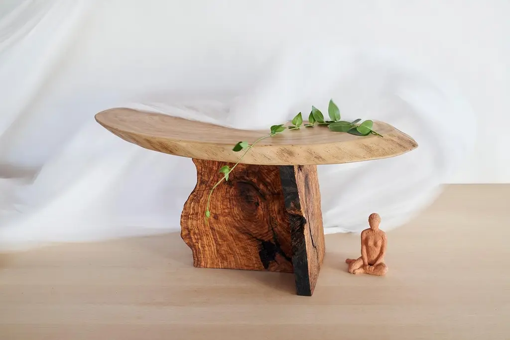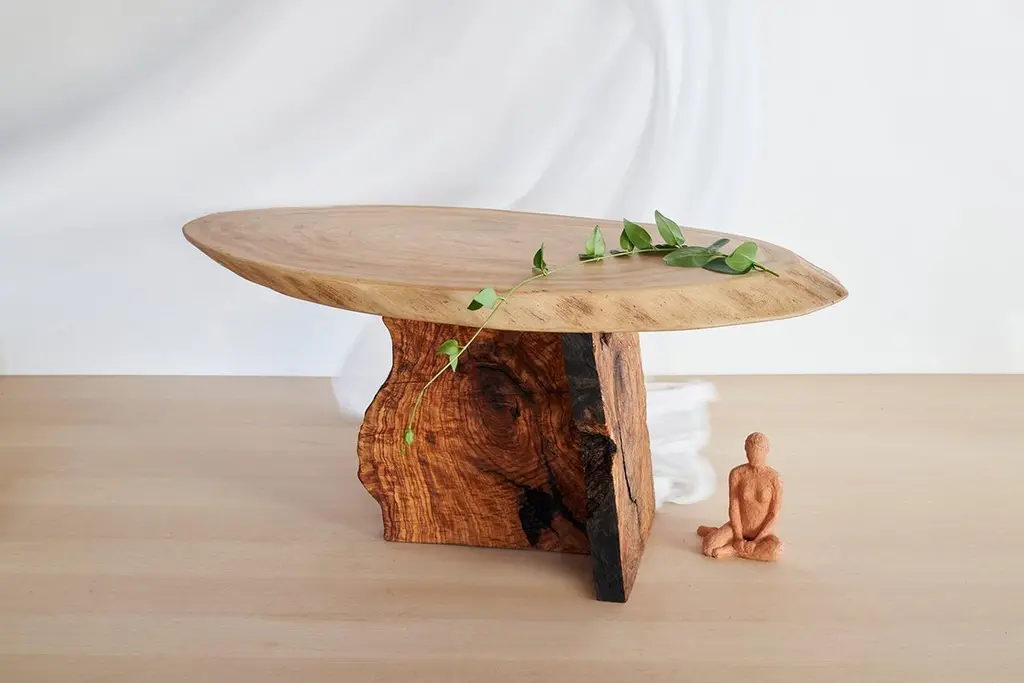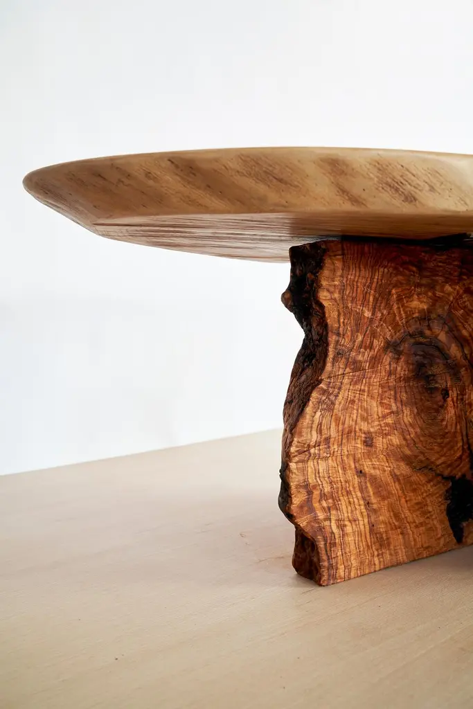 Art Brut Center Table by Jean-Baptiste Van Den HeedeUnique pieceDimensions: W 45 x D 90 x H 43 cmMaterials: Natural Olive Wood on Elm Wood.Living room table from the ART BRUT collection. A functional sculpture that can be seen as a side table as well.Jean-Baptiste Van den Heede defines himself as a cabinetmaker-designer and an artist of academic training and family tradition. He has achieved unique designs of national and international prestige and has several awards in avant-garde furniture.Born in Argentina in 1966, from an Argentine mother and a Belgian father. At 5 years of age he and his family moved to Belgium.To train as a wood professional, he first studied 4 years of carpentry. Then he continued training in cabinetmaking and carving for 5 more years. Always in search of contributing something more to his trade, he studied furniture and antique design, culminating this with the study of Sculpture at the Royal Academies of Fine Arts in Liège (Belgium) and graduating with honors.Work the stone, the wood and experience the forge. From the beginning it is directed towards a search for signs, abstract writings and unrealistic figures in analogy with other “primitive” cultures. He taught drawing and sculpture in Brussels at the private school “la main et l´ esprit” As well as summer courses in Liege (Belgium) “les ateliers d´art contemporain”.In 1995 he went to Barcelona where he taught and investigated the reliefs of different supports such as trees, floors, and especially sewer covers.He searched again analogies between current art and prehistoric, African art, etc.Participated in several exhibitions both at the artistic level and avant-garde design.In 2002, he moved down to Albacete and then to a town in the province where he still works.It is defined as “a search engine without haste or guidelines.” He says: “I only work when I feel a strong and positive inspiration invade me, an energy that I capture from matter, from the air and that I return doing the work until I feel a connection with it.”Private workshop of contemporary art in Letur (Albacete) until 2009.He currently works in his workshop-studio in the Sierra de Madrid (Guadalix de la Sierra) following his career as a cabinetmaker-designer and artist while teaching his trade to students interested in wood.