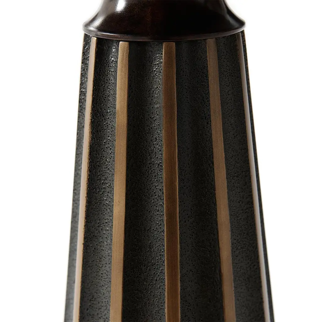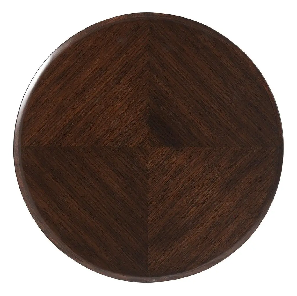 An Art Deco accent table with a polished walnut finish top and base with a figured walnut veneer above a composite tapered radial pedestal base with gilt highlights and textured ground.Dimensions: 16" W x 16" D x 22" H.
