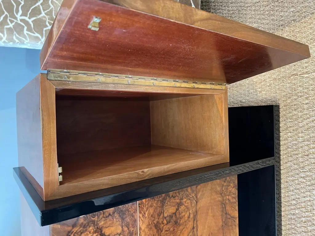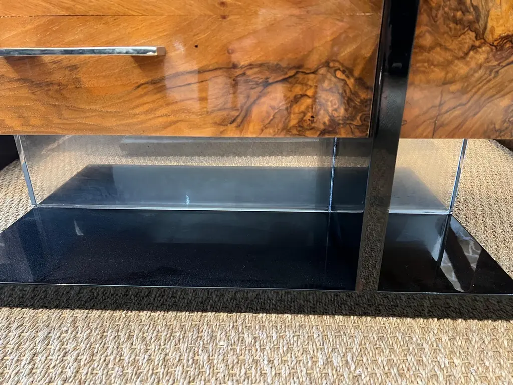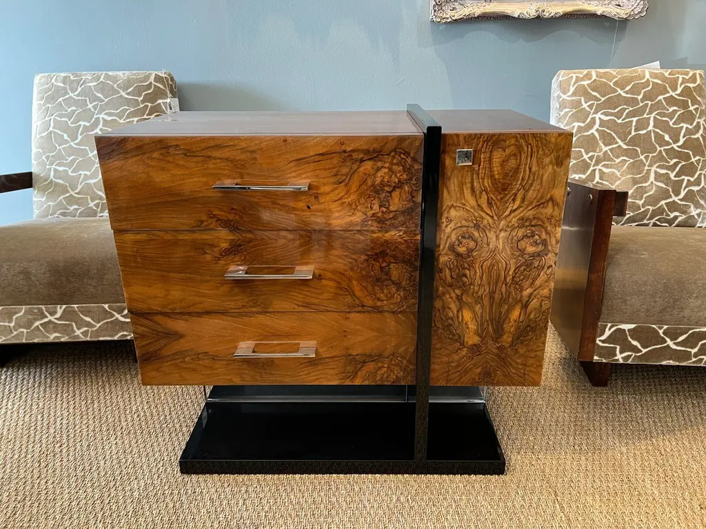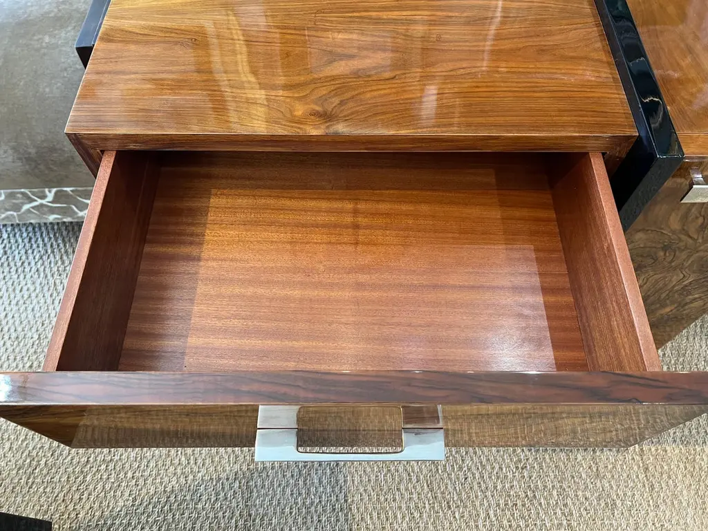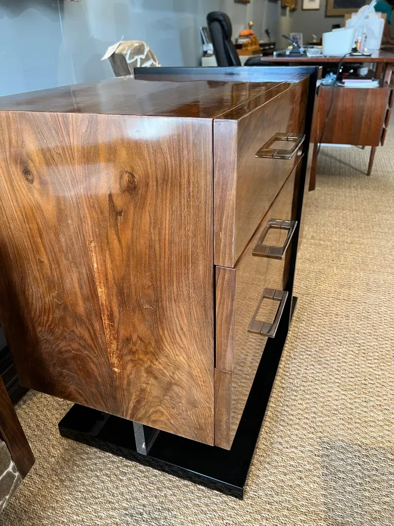 The side table is made of high-quality burl walnut wool. It has an ebonized rectangular flat base. The table has three horizontal drawers and one vertical drawer with “sphere-shaped” handles.The condition is very good. France, circa 1930s Measure: 34.5” W x 17.5” D x 30” H.It could be sold separately.