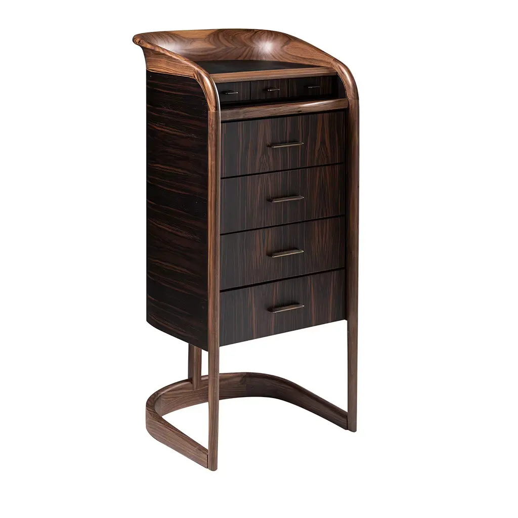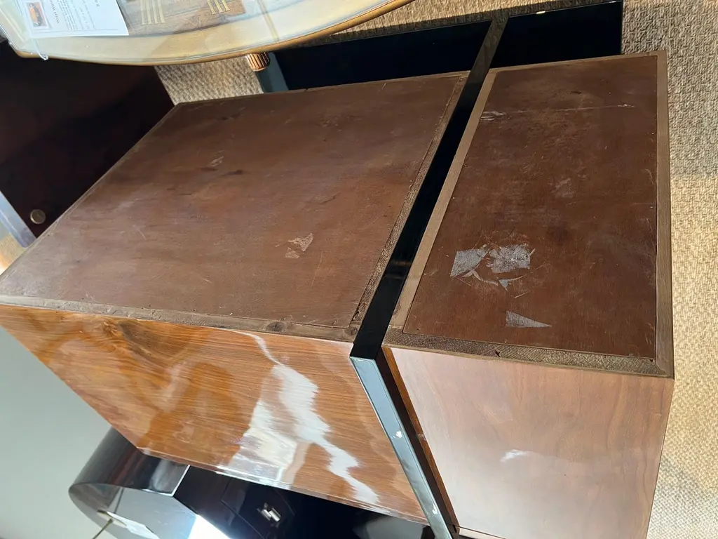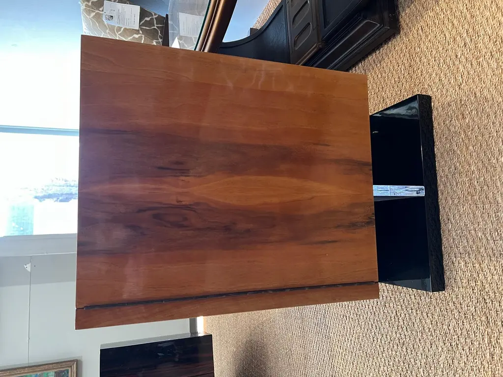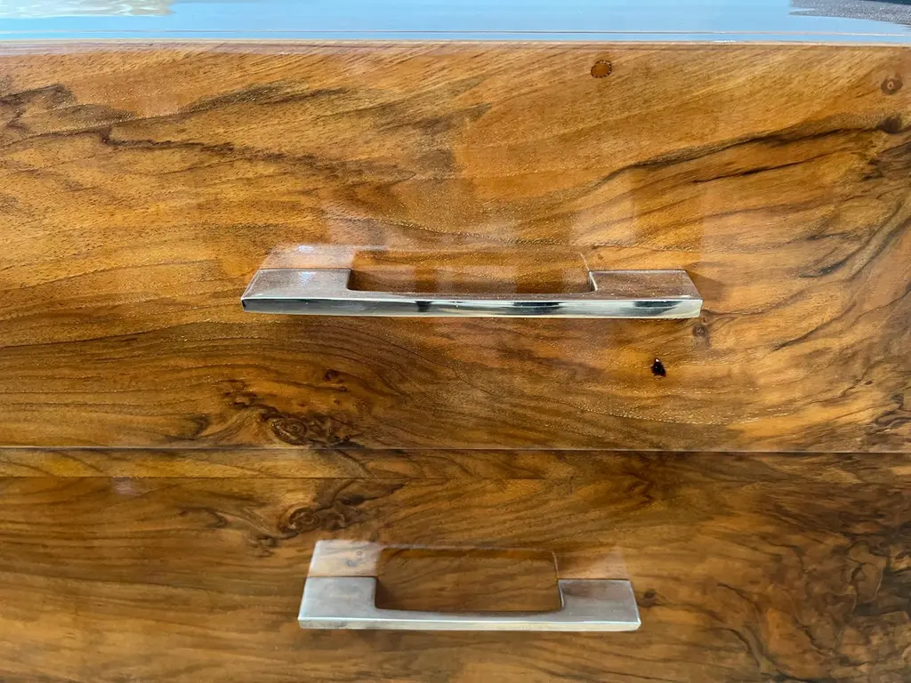 The side table is made of high-quality burl walnut wool. It has an ebonized rectangular flat base. The table has three horizontal drawers and one vertical drawer with “sphere-shaped” handles.The condition is very good. France, circa 1930s Measure: 34.5” W x 17.5” D x 30” H.It could be sold separately.